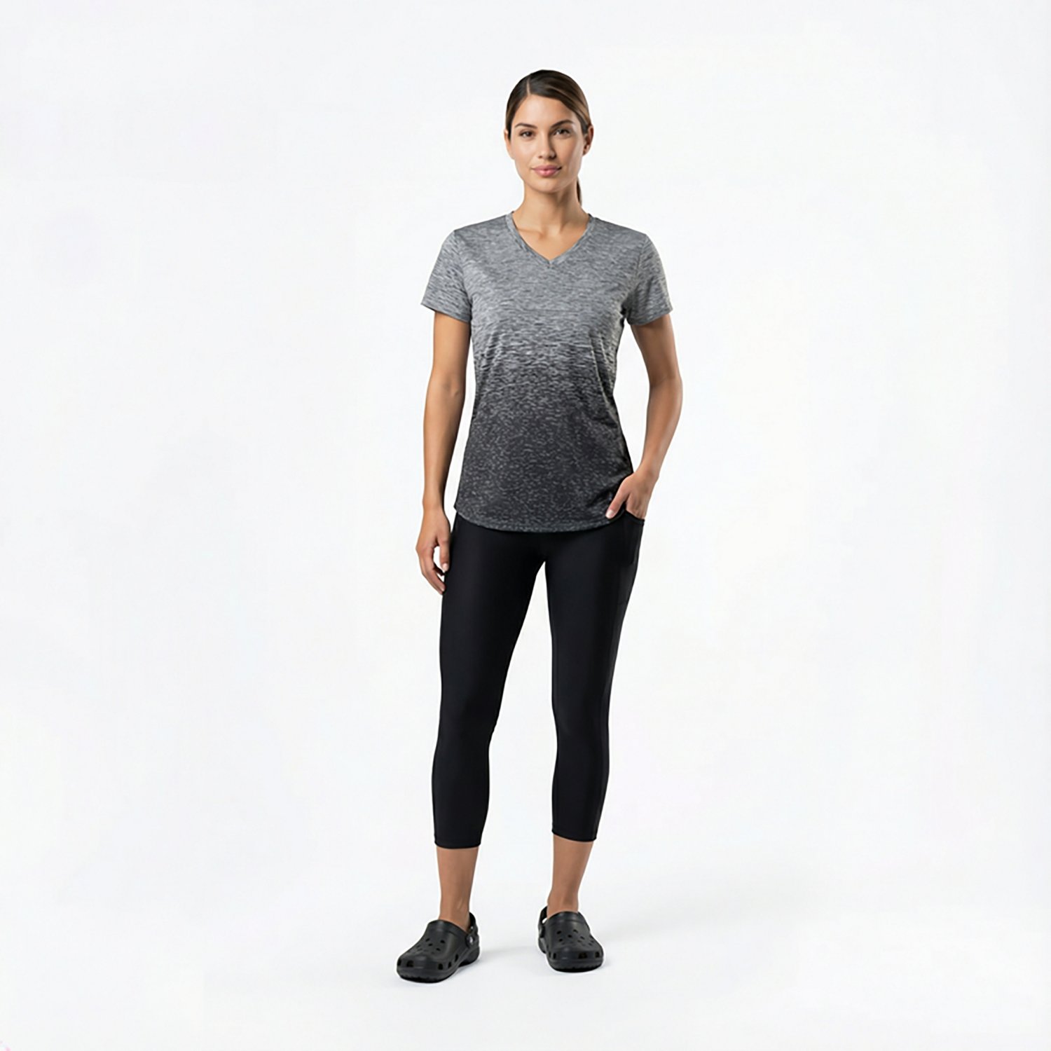 Work up a sweat in comfort wearing the BCG Women's Ombre V-neck Training T-shirt. The moisture-wicking technology helps gets rid of sweat, while the reflective details help you be seen in lowlight situations. The 100% polyester fabric provides soft and durability.