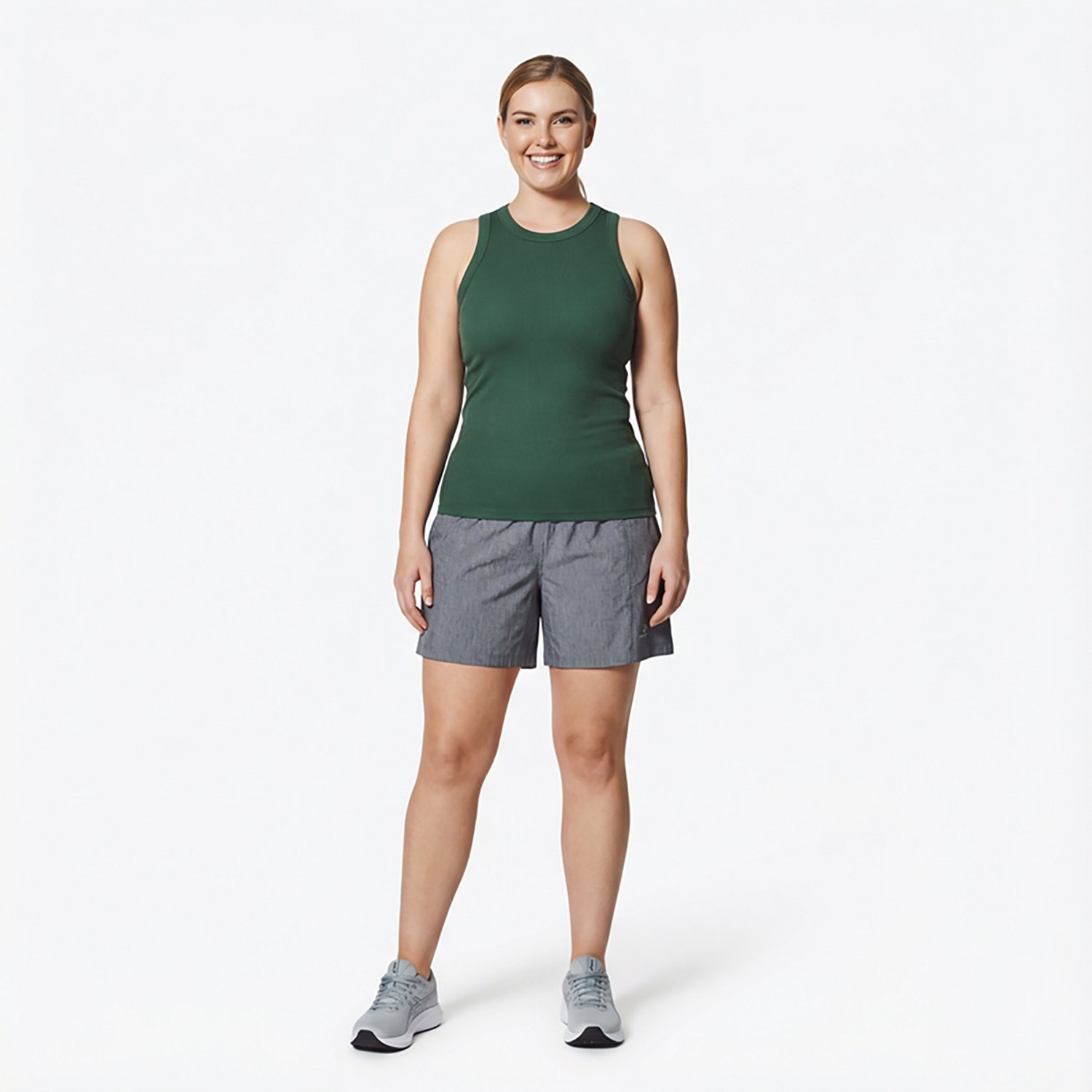 Enhance your comfort by wearing the BCG Women's Sign High Neck Solid Rib Tank Top. The cotton blend fabric has a ribbed design, and the shirt has a high crew neck.