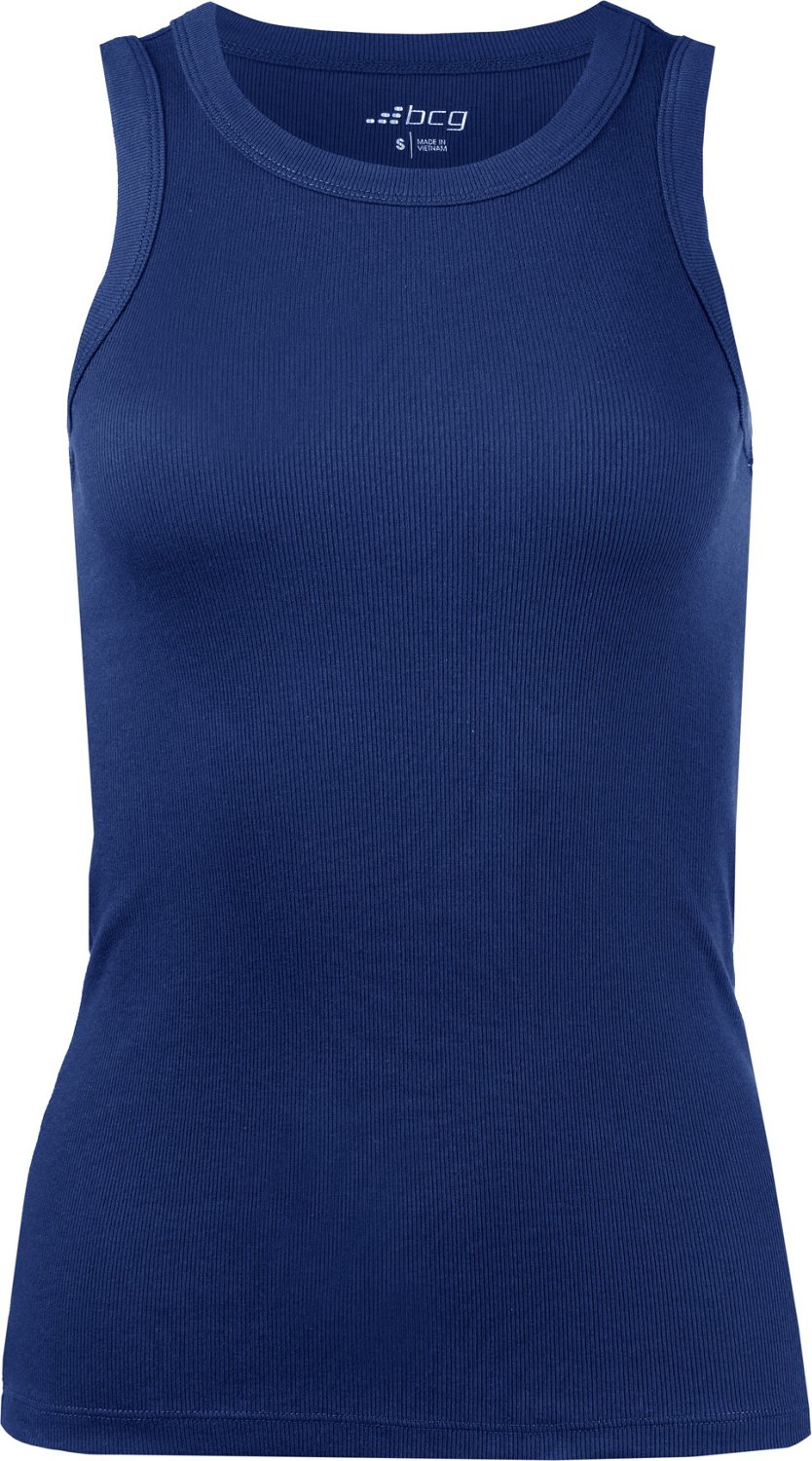 Enhance your comfort by wearing the BCG Women's Sign High Neck Solid Rib Tank Top. The cotton blend fabric has a ribbed design, and the shirt has a high crew neck.