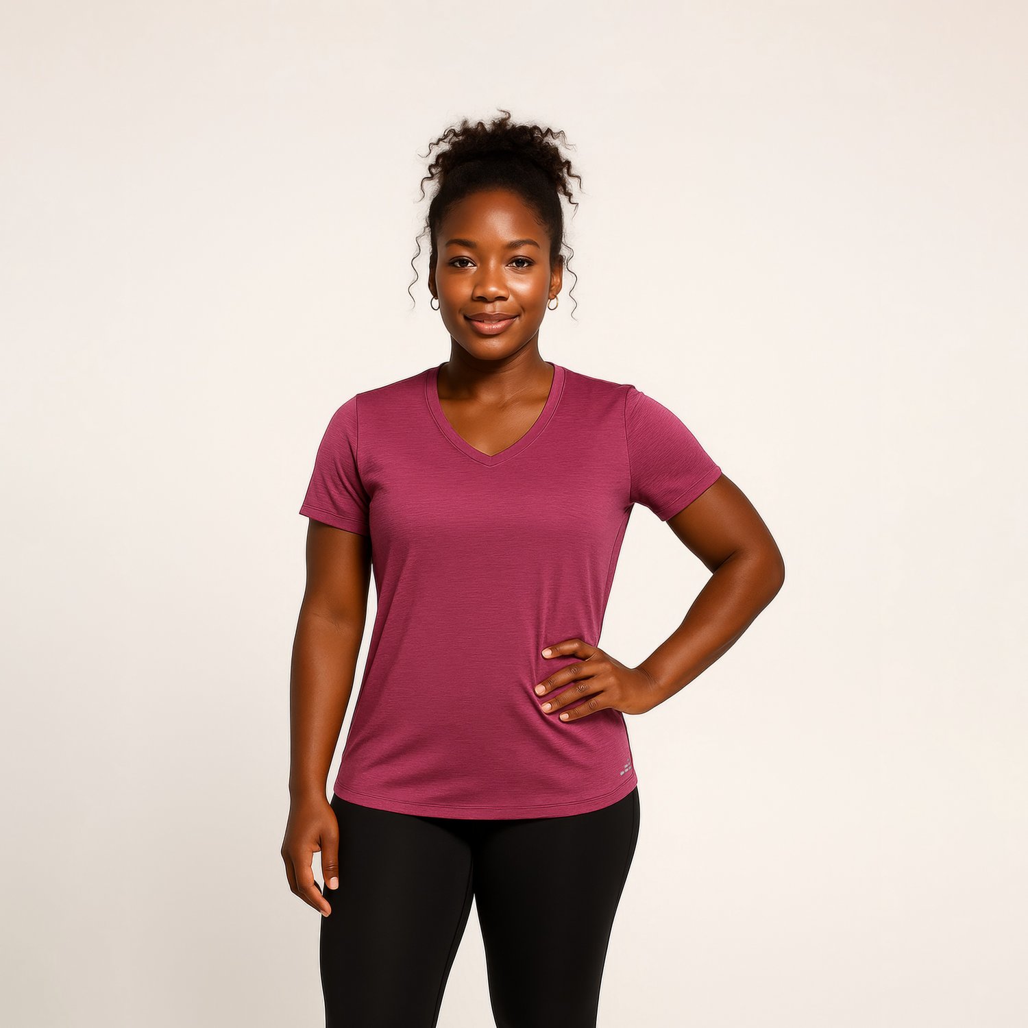 Slip on the BCG Women's Turbo Melange V-neck T-shirt and take on the day in style. The 100% recycled polyester construction withstands wear and tear, and the melange pattern highlights an eye-catching appearance. The moisture-wicking technology helps you stay feeling dry and cool in the heat.