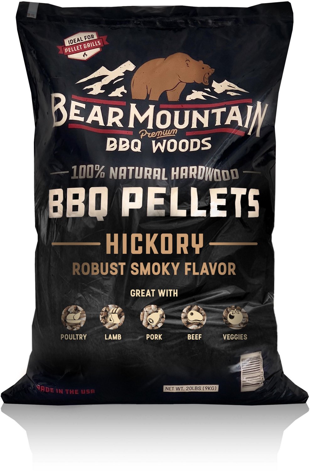 Add hickory-smokiness to your barbecue with the Bear Mountain BBQ Hickory BBQ 20 lb Wood Pellets. These wood pellets are made of a blend of 100% premium, all-natural hardwoods with no flavorings, fillers, or additives. The hickory flavor goes nicely with poultry, lamb, pork, beef and veggies to amp-up your dinner.