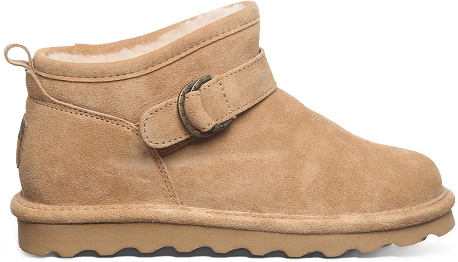 Stay warm in the Bearpaw Women's Petite Boots. These ankle-height boots have suede uppers and D-ring buckles for a stylish look that pairs well with jeans, leggings and dresses. Rubber outsoles and comfort insoles provide a lightweight feel. Finished with wool liners and a water-repellent coating, these boots help your feet stay dry and cozy.
