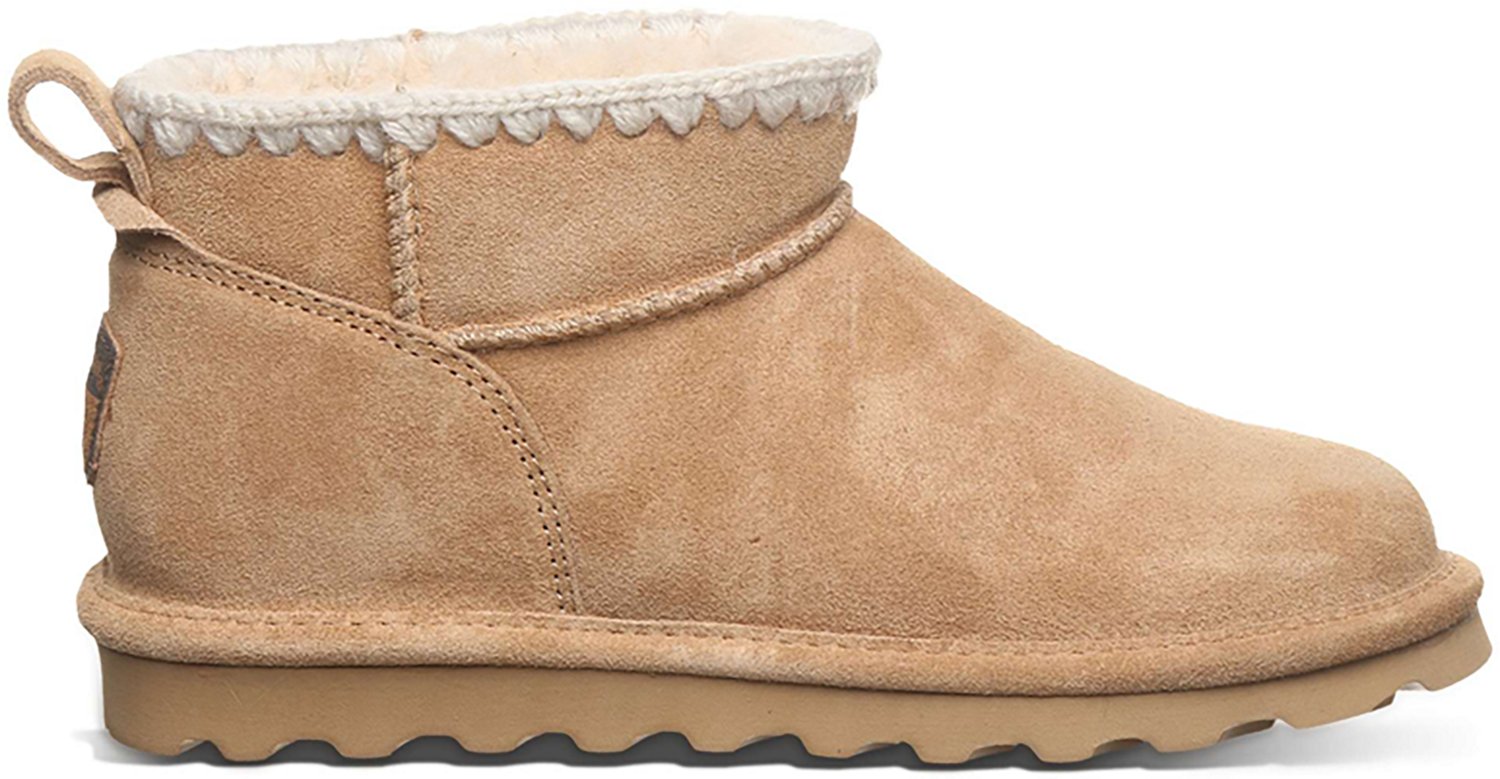 Add an eye-popping boot to your winter wardrobe with the Bearpaw Women's Shorty Crochet Boots. These lightweight ankle-height boots feature durable suede uppers and rubber outsoles. Crochet accents add a touch of elegance, and the wool footbeds provide comfortable cushioning. Wool linings and a water-repellent finish help your feet stay comfy, cozy and dry.
