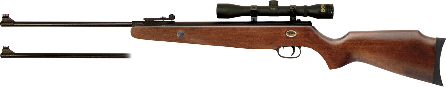 The Beeman Grizzly X2 .177/.22 Caliber Air Rifle has a wooden stock and includes 2 barrels with break-open action to accept both .177 and .22 caliber pellets. The 4 x 32-millimeter scope and fiber optics on both barrels promote a high level of accuracy.