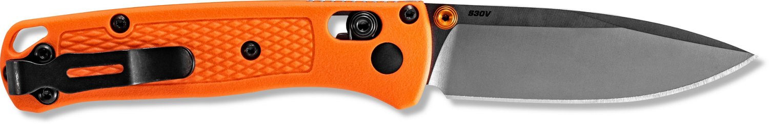 The Benchmade Mini Bugout Drop Point Knife features a folding stainless steel drop point blade that is ideal for everyday use and utility. A grivory handle is molded for easy gripping and features a lanyard hole and belt clip. The small size fits easily in a mint tin or pocket, making this knife an ideal on-the-go companion.