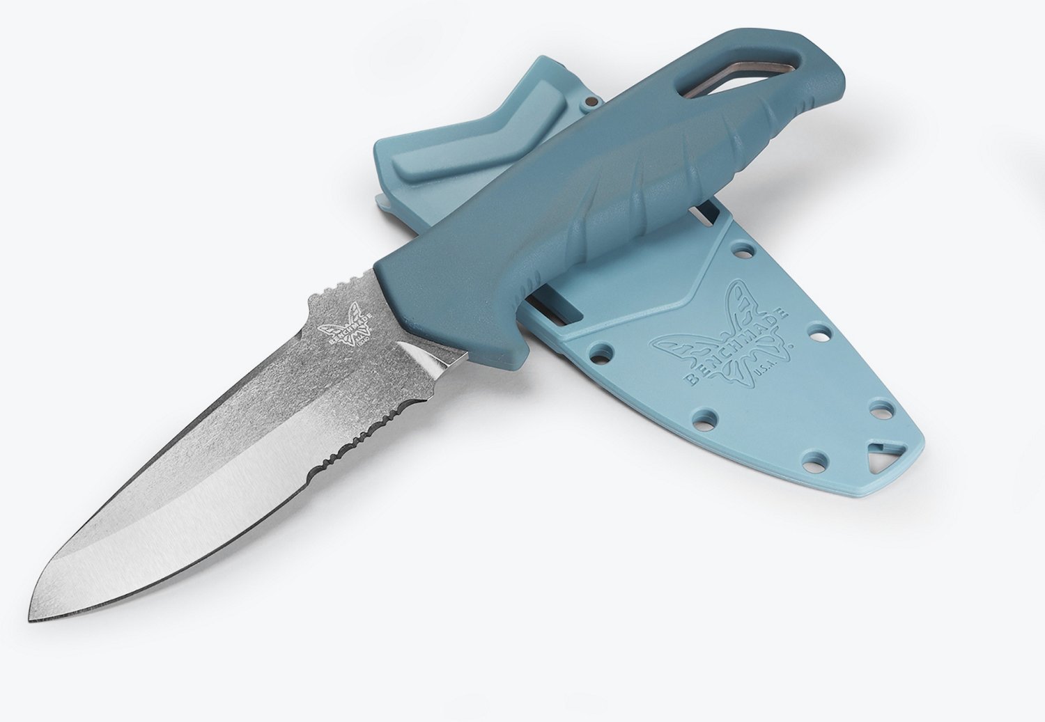 The Benchmade Undercurrent Fixed Fishing Knife features a 4.32-inch fixed, serrated curved blade made from corrosion-resistant stainless steel for cutting lines, ropes and bait. The Santroprene handle is durable and provides a secure grip in wet conditions, and a molded sheath is included to protect the knife's blade when not in use. A push-button retention release on the sheath allows for easy access.