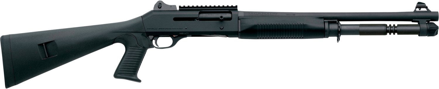 Take aim with the Benelli M4 12 Gauge Semiautomatic ARGO Tactical Shotgun. This semiautomatic shotgun has an ARGO (Auto Regulating Gas Operated) pistol-driven system and a Picatinny rail. It has a pistol-grip stock and a ghost-ring rear sight.