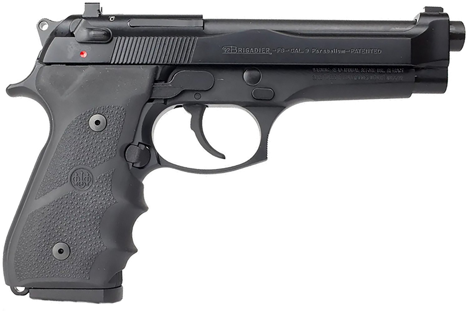 The Beretta 92FS Brigadier 9mm Pistol boasts single/double action and has a 10+1-round capacity. It's built with a blued barrel, heavy profile slide and a Hogue molded rubber grip.