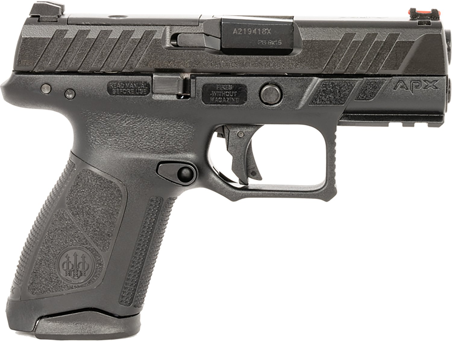The Beretta APX A1 Compact 9mm Pistol has a 3.7-inch steel barrel and a capacity of 10+1 rounds. This compact handgun has an optics-ready serrated steel slide and a polymer frame with a Picatinny rail. It has interchangeable backstrap grips, a fiber optic front sight and a serrated rear sight.