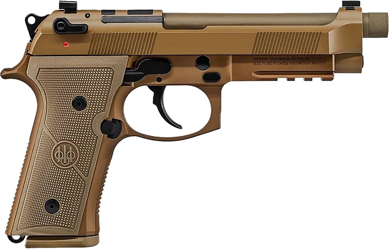 Arm yourself with the Beretta M9A4 9mm Double and Single Action Pistol. It is double and single action with a 15-round capacity. The steel threaded barrel is 4.8-inches long, and its polymer frame is equipped with a beavertail and Picatinny rail. The steel serrated slide finishes off the design.