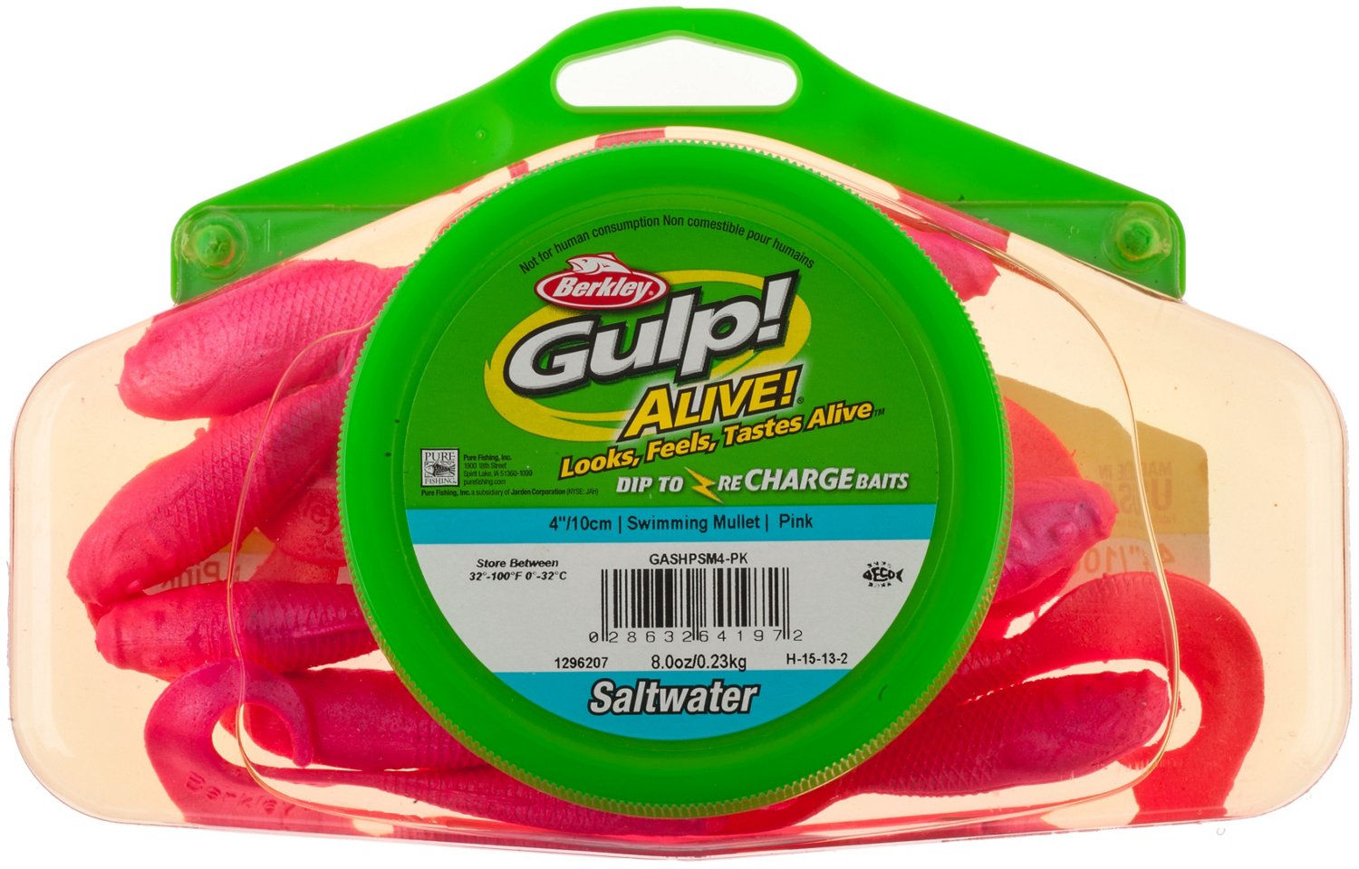 Soaked in an attractant, the Berkley® Gulp! Alive!® 4" Swimming Mullet Half-Pint Bucket draw a variety of saltwater fish species to your hook. These realistic, mullet-shaped baits are rechargeable.