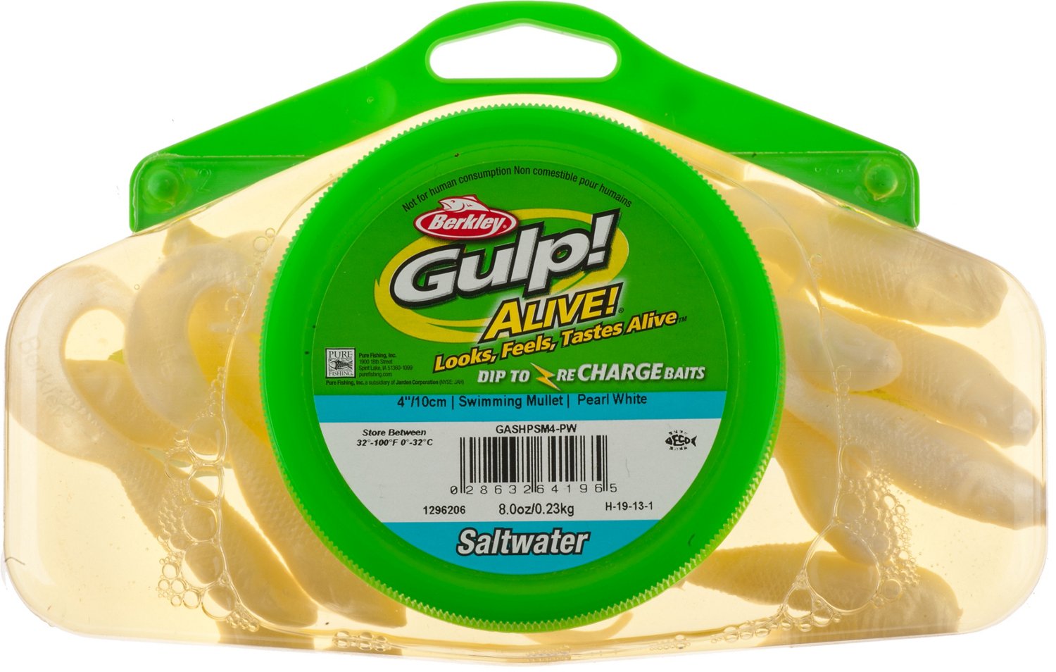Soaked in an attractant, the Berkley® Gulp! Alive!® 4" Swimming Mullet Half-Pint Bucket draw a variety of saltwater fish species to your hook. These realistic, mullet-shaped baits are rechargeable.