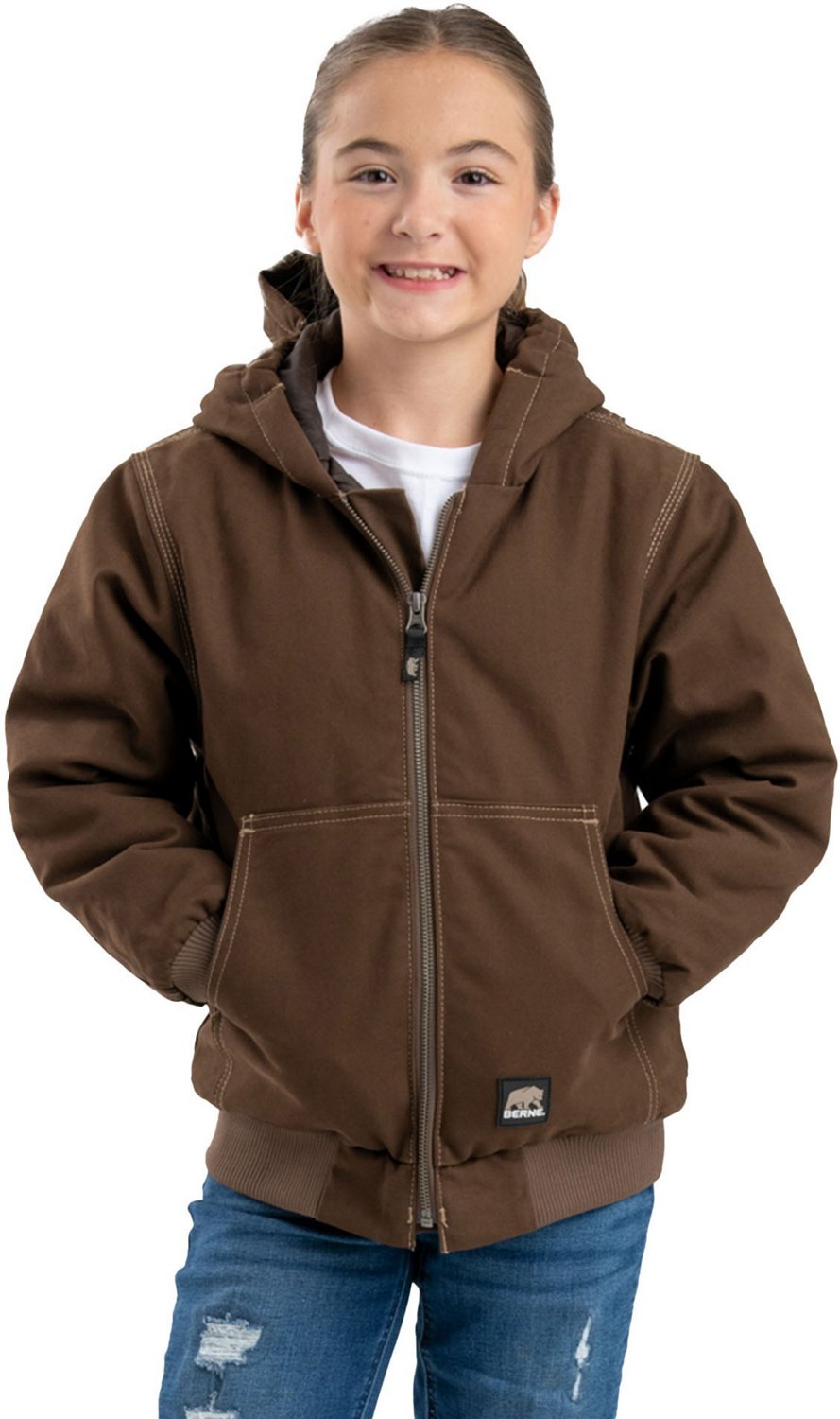 Keep kids comfortable on the job with the Berne Boys' Highland Softstone Duck Hooded Jacket. The sanded duck shell provides durable protection, and polyfill insulation offers warmth. Rib knit cuffs and hem offer a snug fit to keep out the elements.