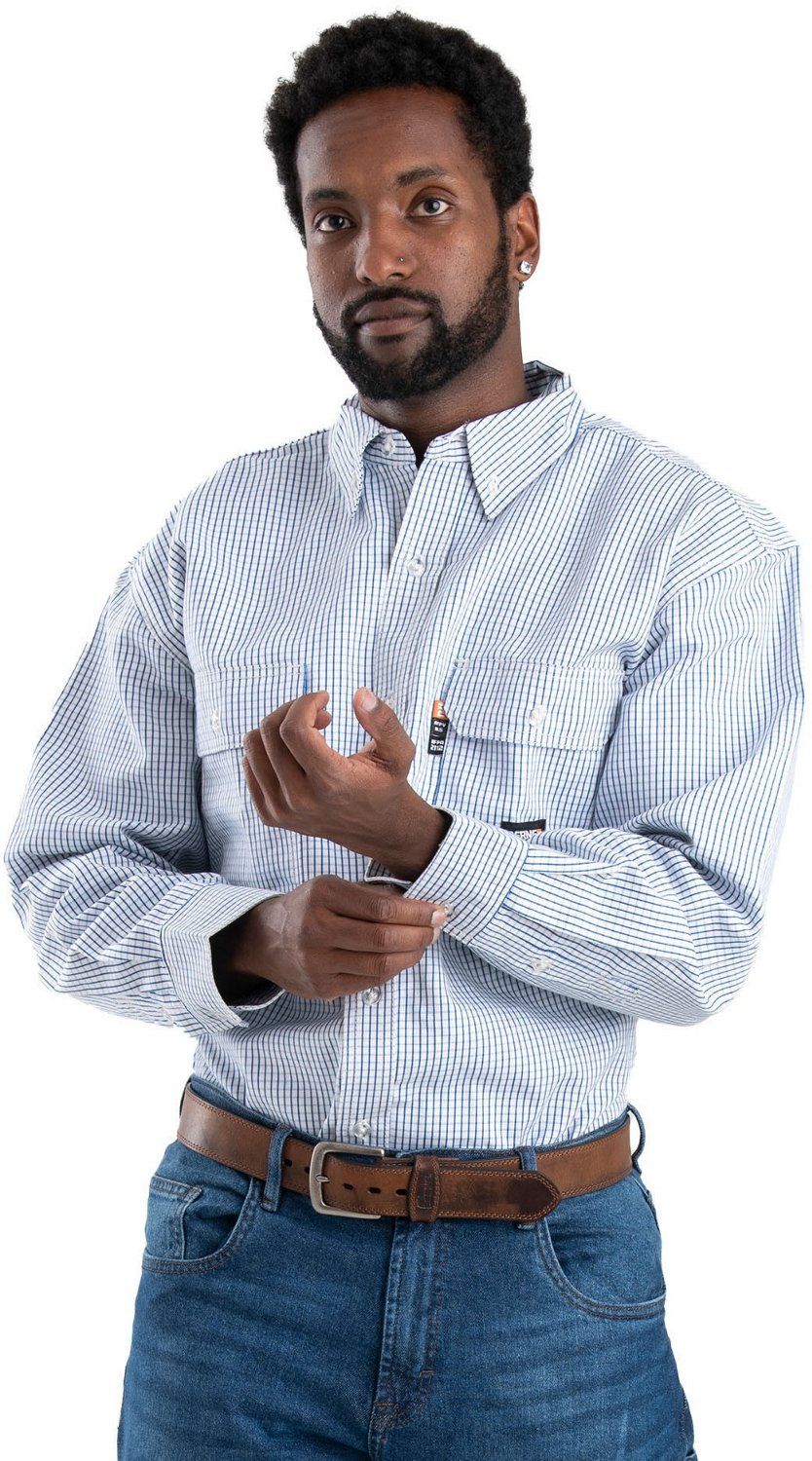 Work in comfort and safety with the Berne Men's Flame Resistant Button Down Plaid Long Sleeve Work Shirt. The soft cotton twill construction meets standards for flame resistance. Button cuffs and an adjustable back yoke ensure a comfortable fit.