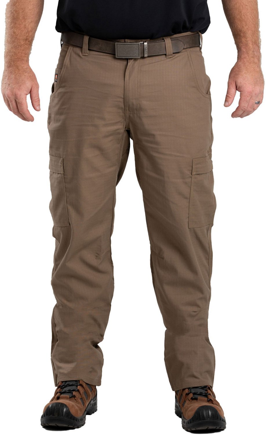 Stay safe on the job with Berne Men's Flame Resistant Ripstop Cargo Pants. The cotton blend ripstop fabric is flame resistant, and the button front and brass fly resist electricity arcing. Triple-stitched seams and reinforced hems provide extra durability. The relaxed fit and articulated knees let you move naturally.