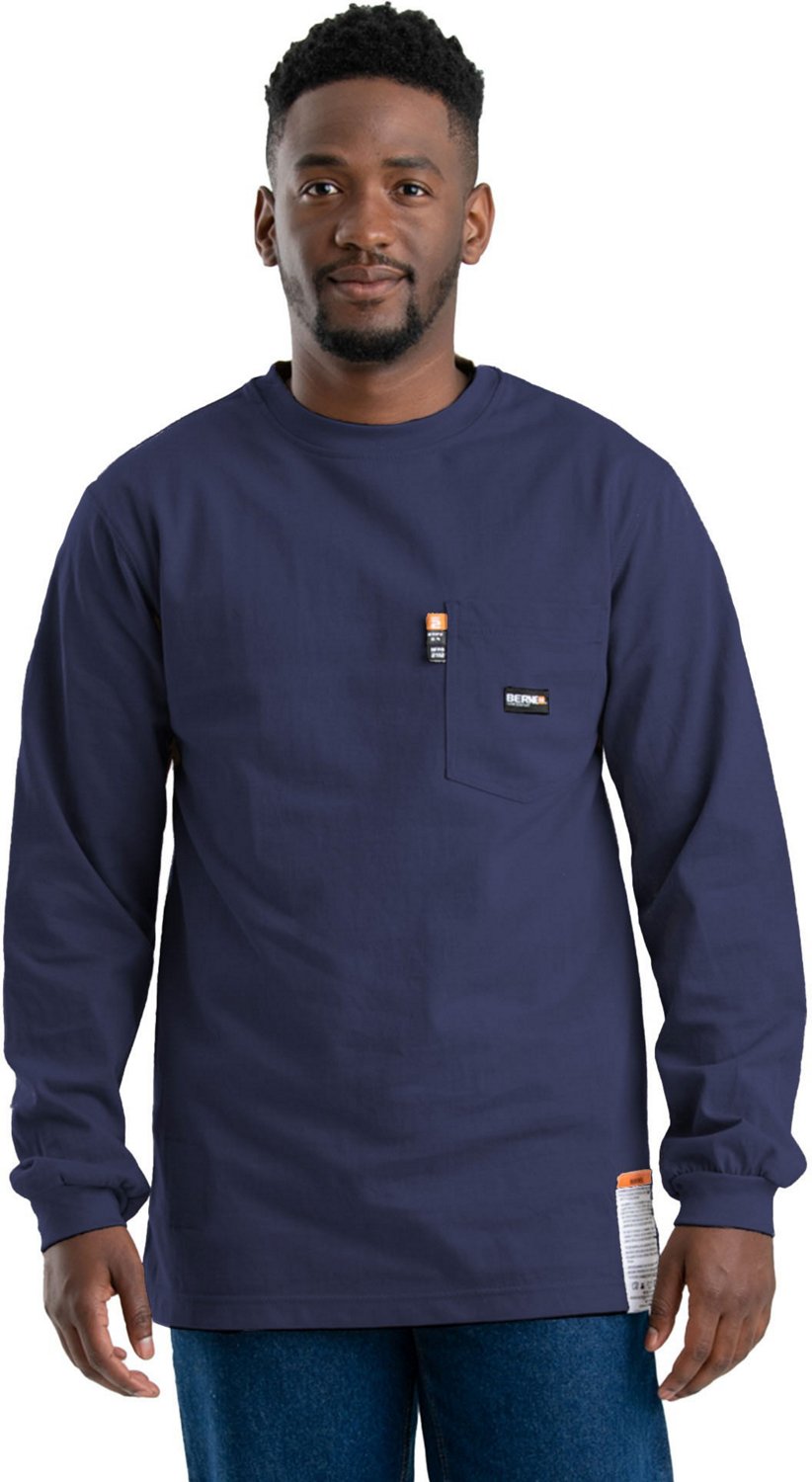 Protect yourself at work with the Berne Men's Flame Resistant T-shirt, which features flame-resistant capabilities. Made with cotton, this long-sleeve shirt has a left chest pocket and side seams designed to reduce twisting.
