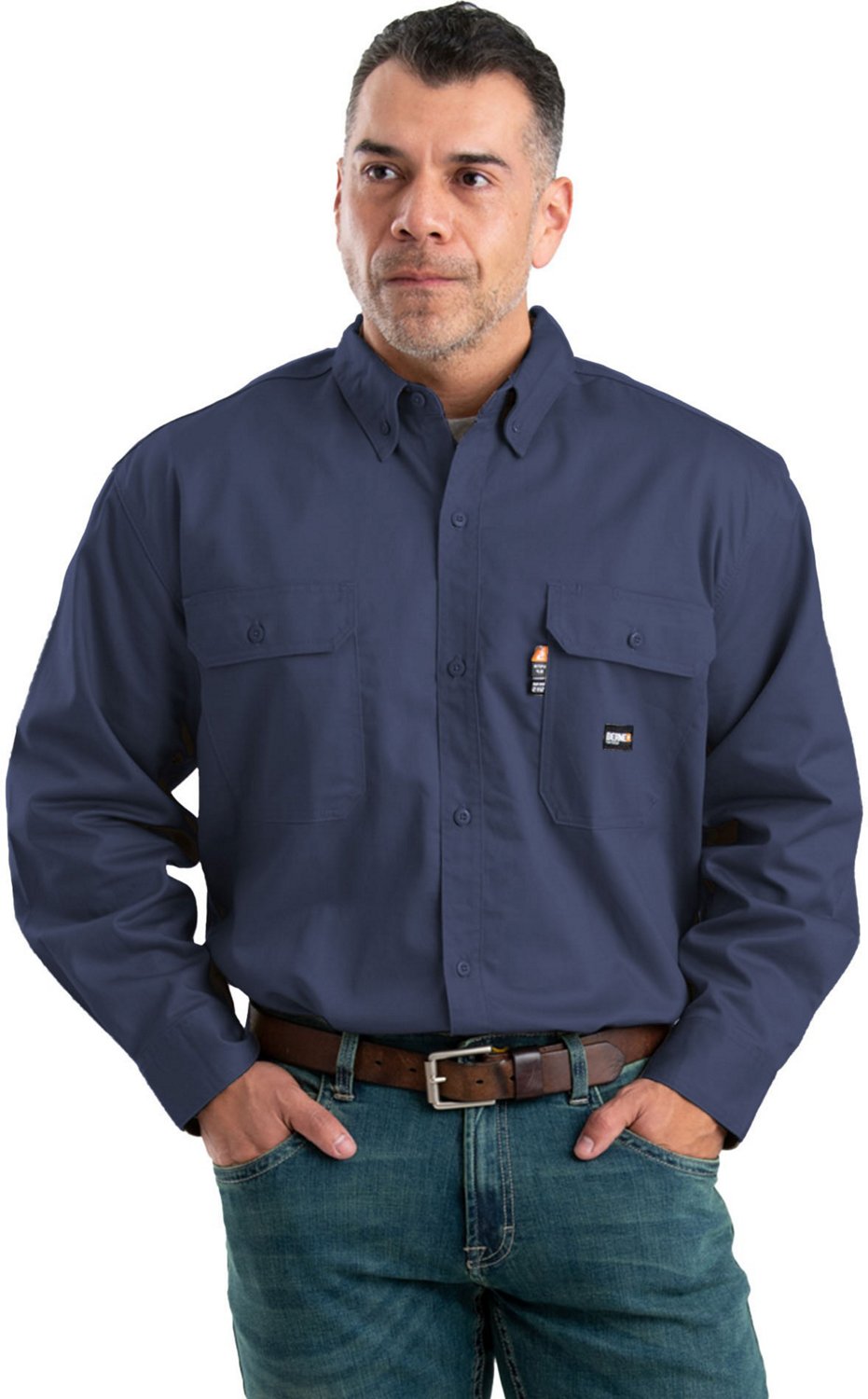Remain safe around fire on the jobsite with this Berne Men's Flame Resistant Button-Down Workshirt. Made of Flame Resistant twill, the shirt meets a variety of safety requirements, while the long sleeves feature adjustable button cuffs for custom comfort. The chest pockets feature button-close flaps.