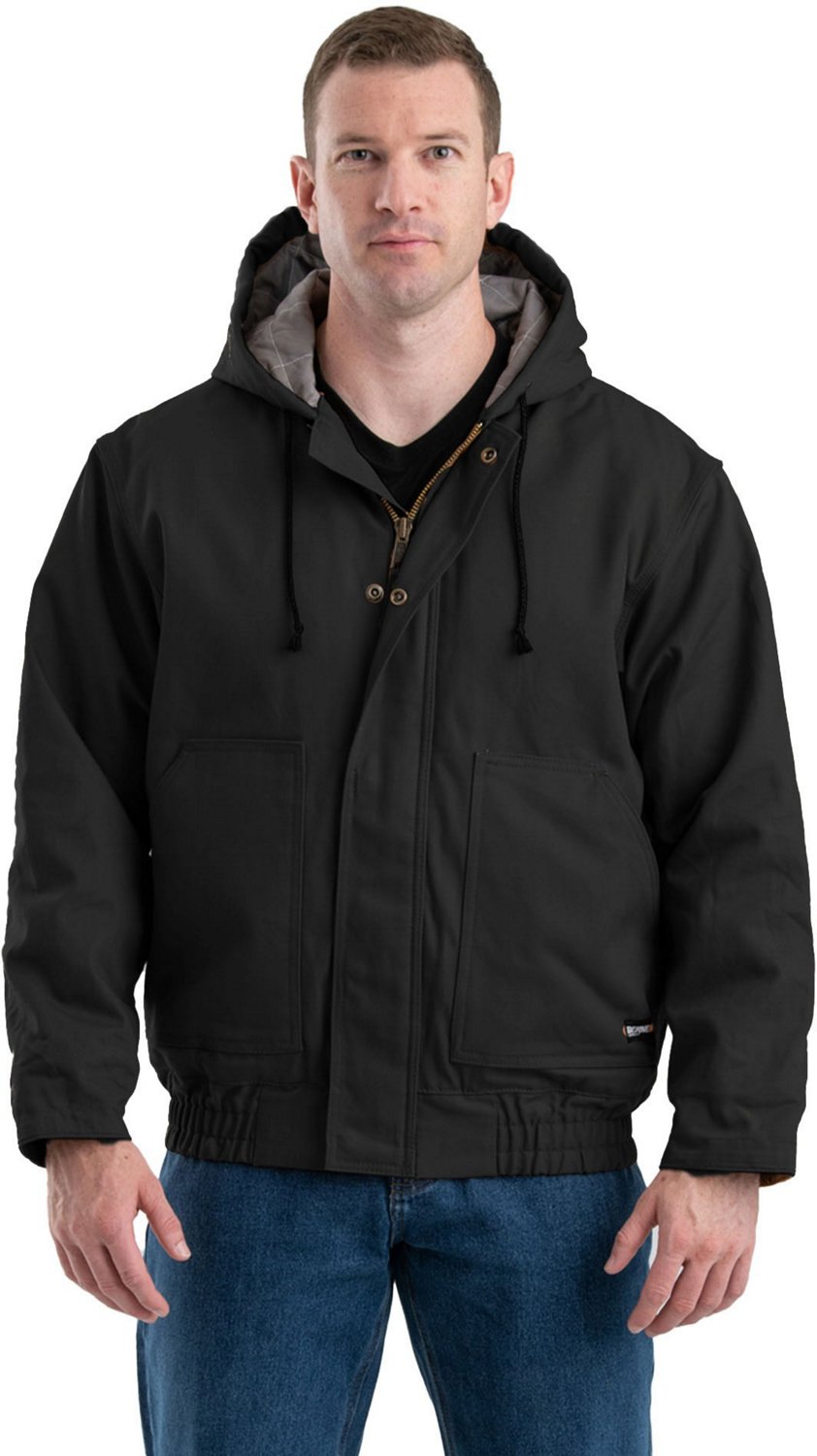 Remain warm and safe while working outside in this Berne Men's FR Hooded Jacket. Featuring flame-resistant fabric, liner, pocket linings, brass zipper and cuffs, the jacket helps keep you protected against fire. The insulated 3-piece hood and elastic waistband help shield you from the elements.