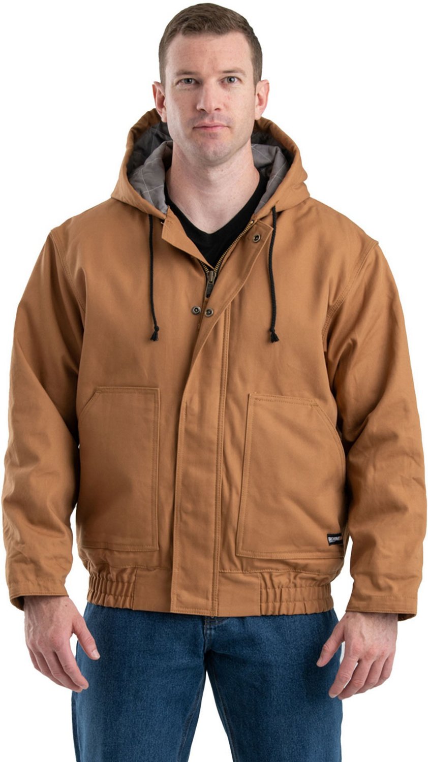 Remain warm and safe while working outside in this Berne Men's Flame Resistant Hooded Jacket. Featuring Flame Resistant fabric, liner, pocket linings, brass zipper and cuffs, the jacket helps keep you protected against fire. The insulated 3-piece hood and elastic waistband help shield you Flame Resistant om the elements.