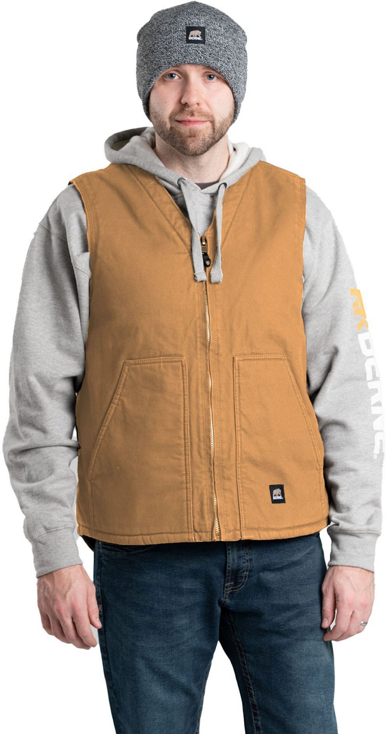 Layer up against the cold with a Berne Men's Heartland Sherpa-Lined Washed Duck V-Neck Vest. The sanded duck exterior features triple stitch main seams for durability, and the Sherpa liner adds softness. Plenty of pockets provide convenient storage for tools and essentials.