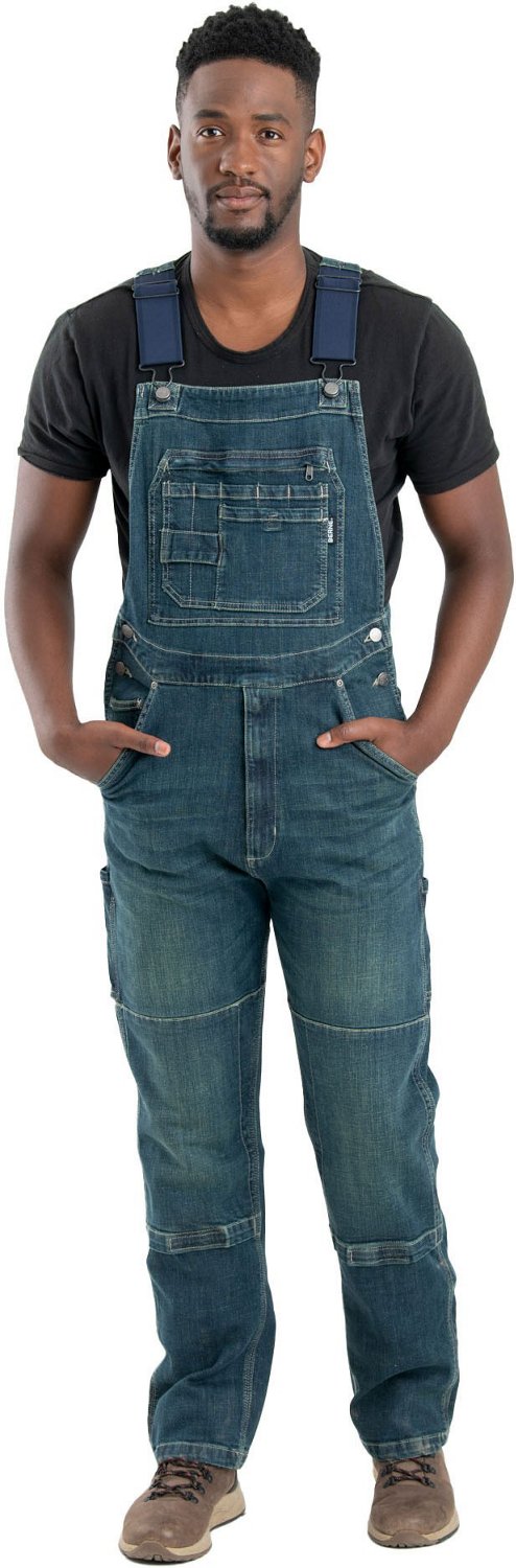 Work hard in comfort while wearing the Berne Men's Highland Unlined Washed Flex Denim Bib Overall. Stretch denim fabric offers softness and ease of movement. The elasticated bib straps adjust for a comfortable fit, while plenty of pockets provide convenient access to tools. Reinforced knees and triple-stitched seams add durability.