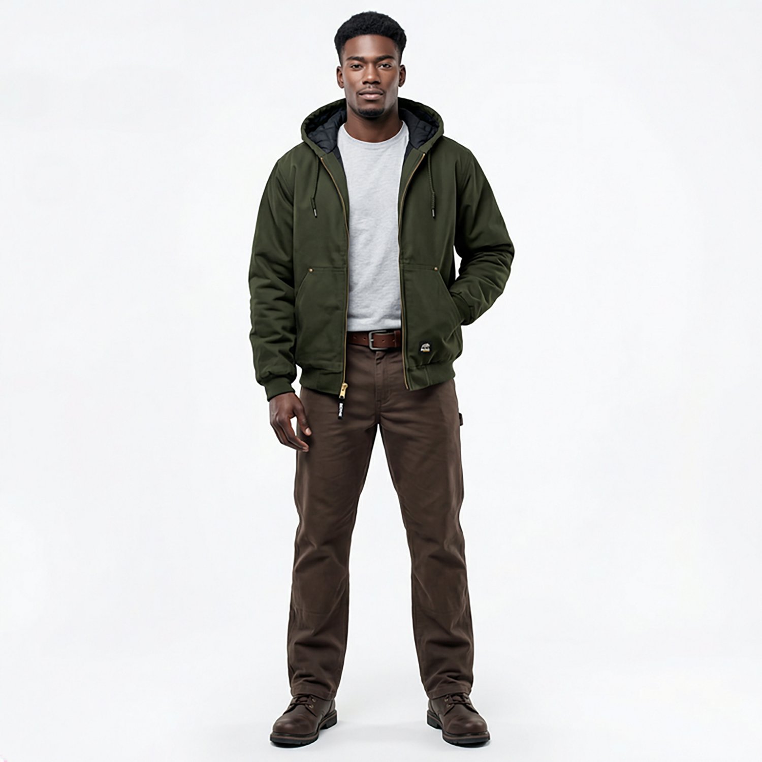 Beat the cold as you stay comfortable on the job in the Berne Men's Highland Washed Hooded Jacket. The 100% cotton sanded duck construction delivers comfort and durability. The quilted insulation in the body and sleeves supplies cozy warmth, while the three-piece insulated hood with drawstrings delivers coverage from the elements.