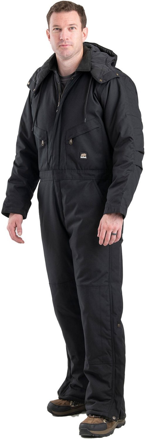 Protect against the elements with a Berne Men's Icecap Insulated Coverall. The sturdy nylon shell provides durable wind- and waterproof protection, and the arctic-weight insulation adds warmth. The fleece-lined collar offers softness, and a removable hood helps you adapt to the weather. Back and elbow pleats allow free range of movement.