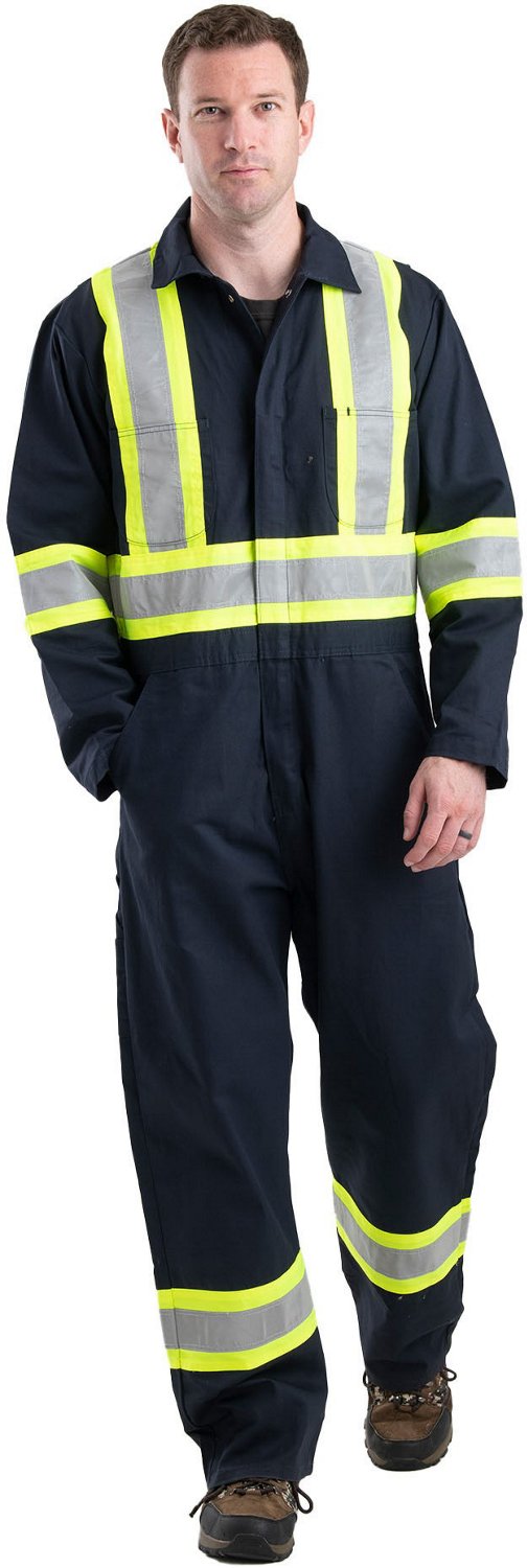 Work safely while wearing the Berne Men's Safety Striped Unlined Coverall. Cotton blend twill fabric offers durability, and plenty of pockets provide convenient access to tools. Reflective taping offers enhanced visibility for on-the-job safety.