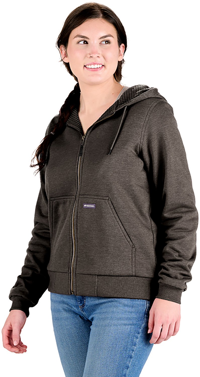 Warmth and comfort are the order of your day when you wear this Berne Women's Heritage Hoodie on your next outdoor excursion. With a shell made of soft cotton-polyester fleece, and sporting a polyester ripstop fleece lining, it provides the ideal combo of a pleasant feel and go-anywhere durability. The full-zip closure maintains a cozy fit all outing long.