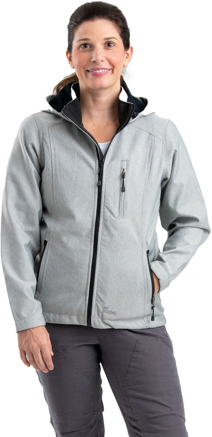 Protect against the elements with the Berne Women's Hooded Softshell Jacket. Its lightweight polyester shell is wind- and water-resistant, and the flannel liner adds warmth and softness. The adjustable cuffs and drawstring hem let you cinch tight against the cold. An extended back provides extra coverage.