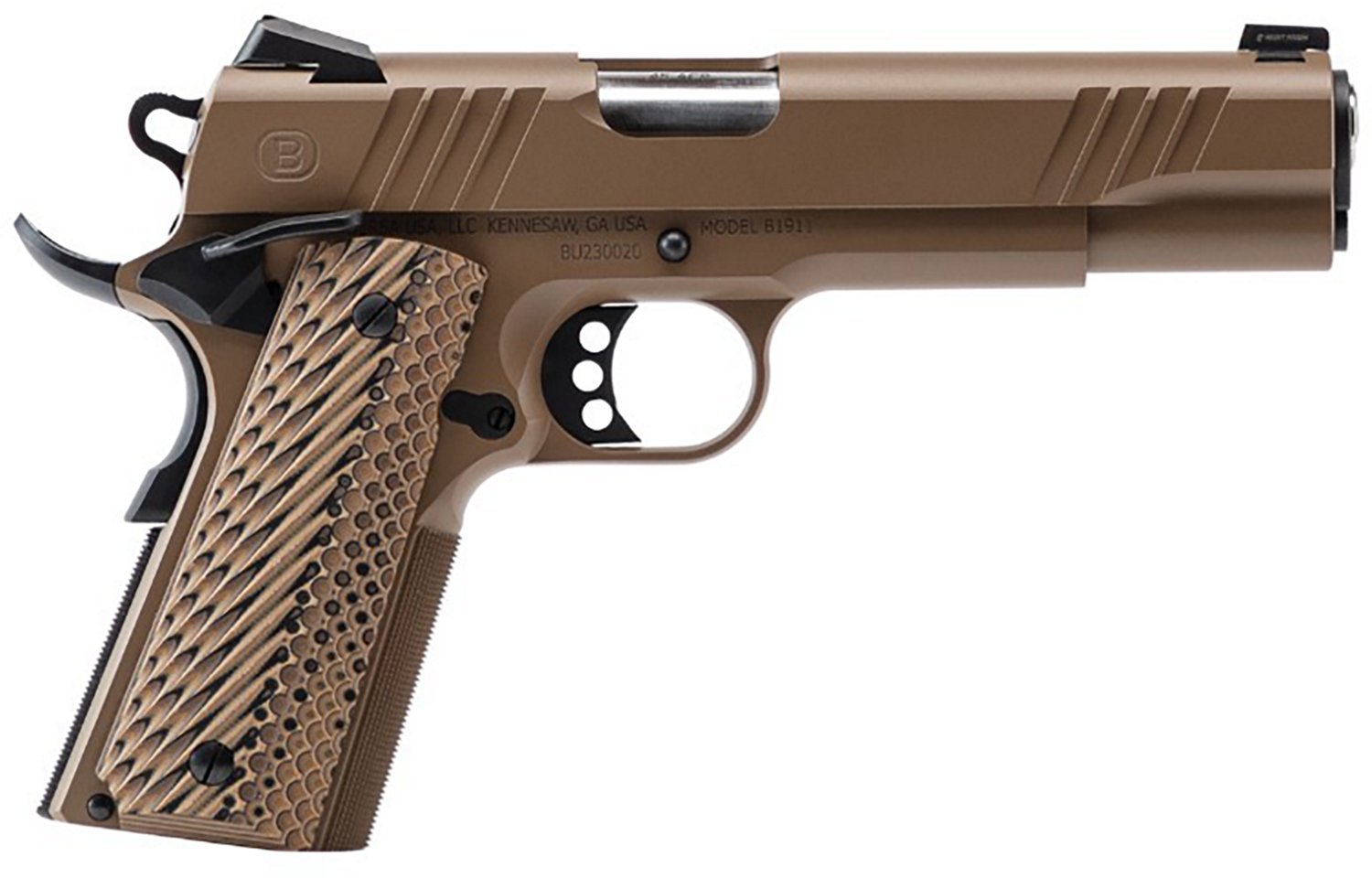 The Bersa 1911 .45 ACP Pistol is single action and has an 8+1-round capacity. It's built with a 416 stainless steel frame and slide and a VZ grip. Dovetailed tritium night sights and an ambidextrous thumb safety complete the design.