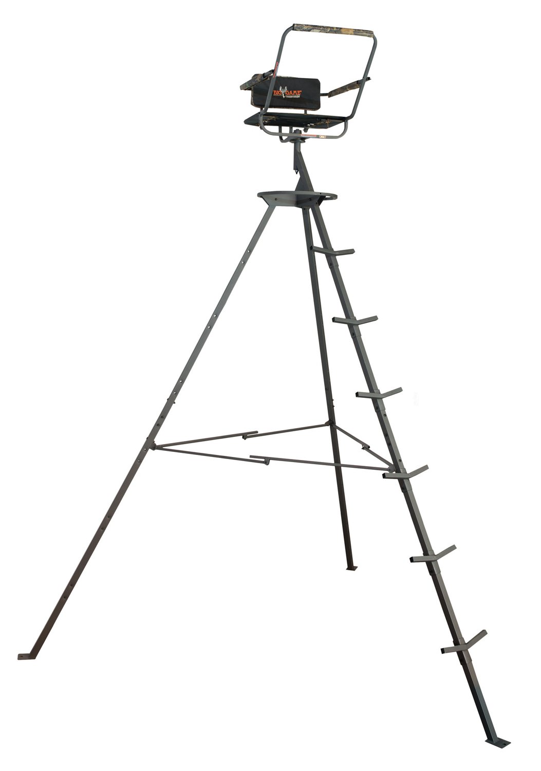 When your prey is giving you the slip, you need to up your game. Gain the advantage of a bird's-eye view with the Big Game Treestands Pursuit 12' Portable Tripod. Spin the Deep Flex-Core™ seat all the way around to survey the land, and steady your firearm against the padded rail to make each shot count. Worried about blowing your cover? Don't be. The camo accents help keep you hidden in the field.