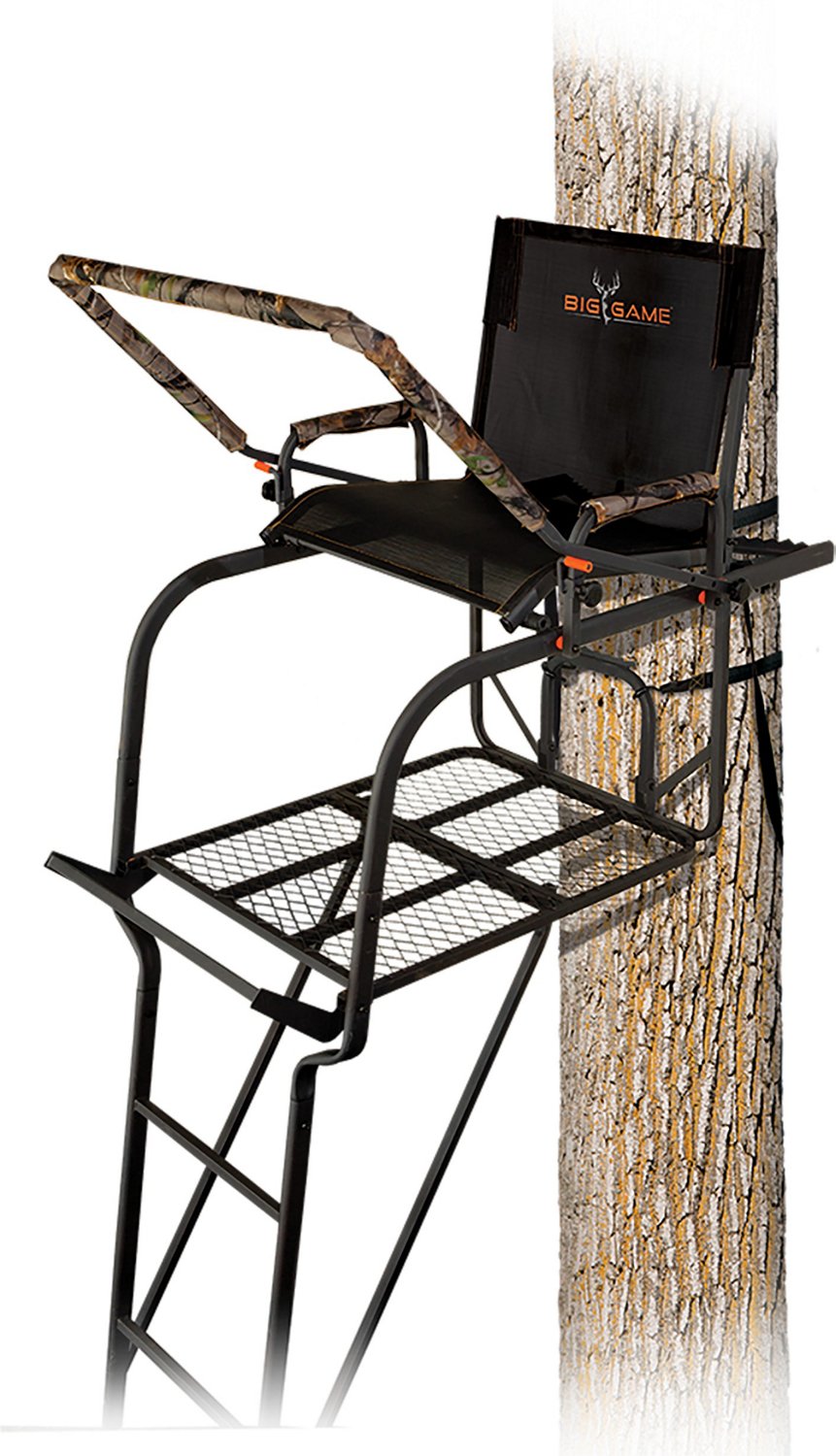 The Big Game Treestands The Hunter HD 1.5 Man Ladder Stand is an essential to have with you in the woods the next time you hunt. The Flex-Tek seat offers comfort, and the wide foot platform enables a wide stance. It includes 1 full-body fall arrest system for your protection and fits a tree diameter of 9 feet or more to help you hunt in most locations.