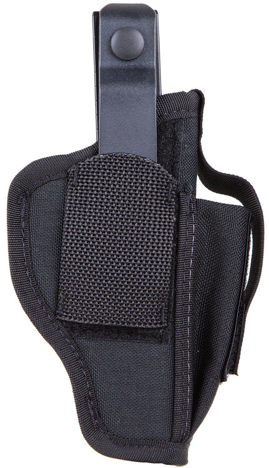 Carry your gun on your belt or inside your waistband with the Blackhawk!® Holster with Magazine Pouch, which offers an adjustable storage area for your magazine or illumination tool (sold separately). The holster features a removable steel spring clip that secures the holster to your waistband and injection-molded belt loops that cover the reversible retention strap and thumb break.