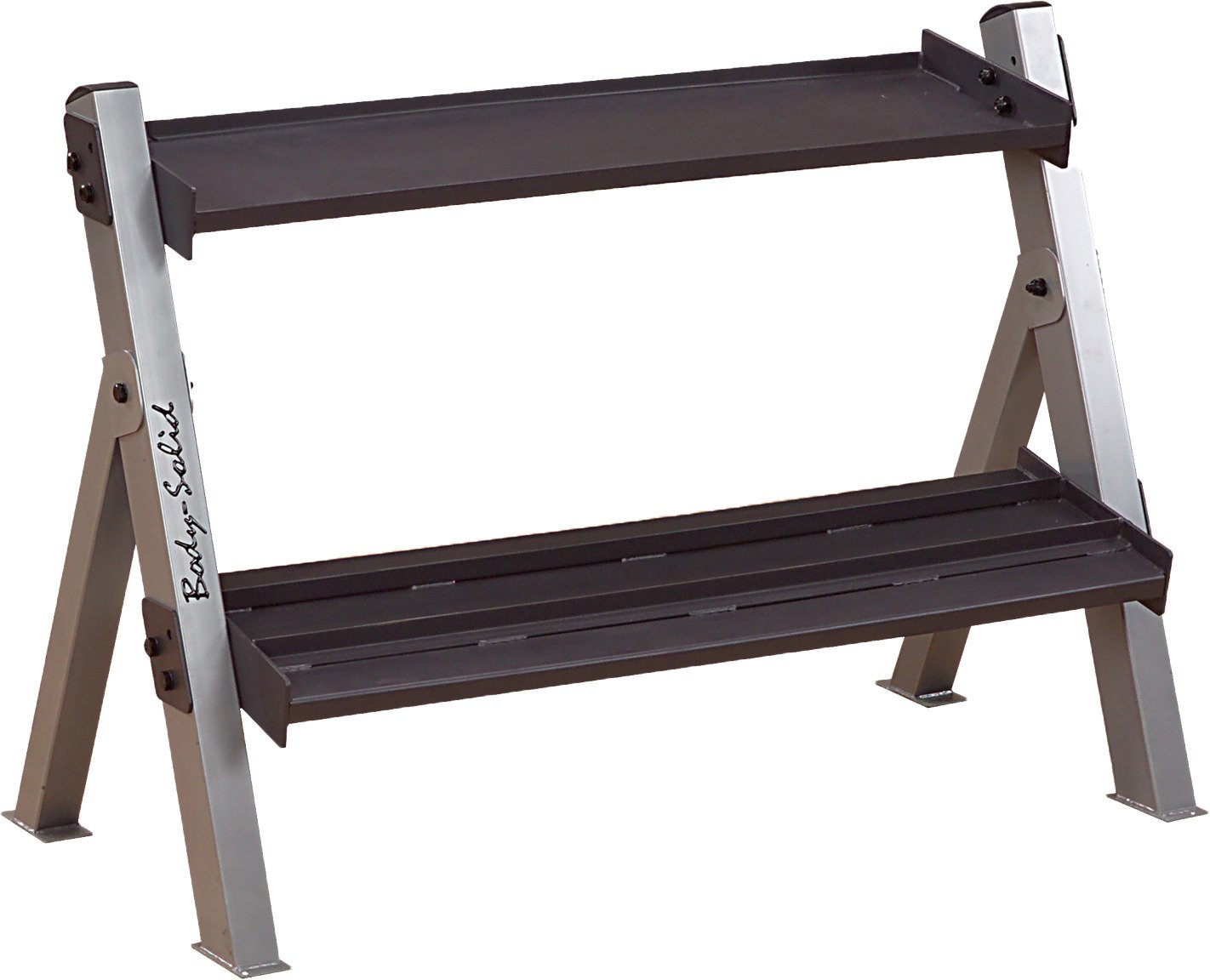 Keep your exercise area organized with the Body-Solid GDKR100 Weight Rack, which is designed with configurable platforms that flip to hold dumbbells or kettlebells (sold separately). The trays measure 39"W x 11"D, and the rack is made with heavy gauge steel that is welded on all sides and deburred for safety.