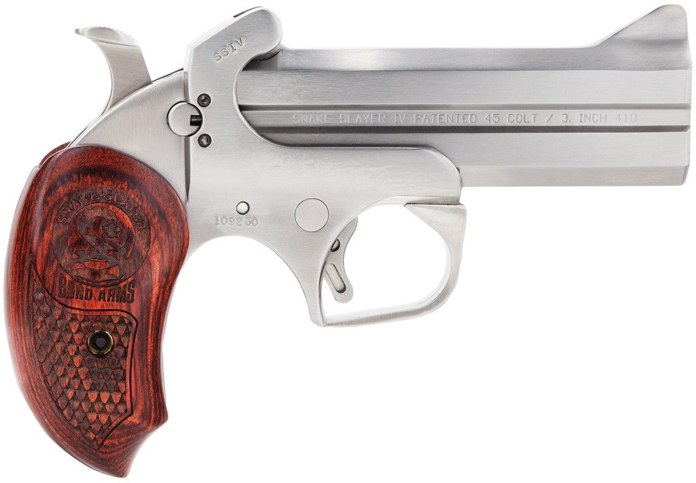 The Bond Arms Snake Slayer IV .45 LC Break-Action Pistol has derringer-style construction and a double-barrel design that can accept .410 bore shotshells and .45 LC ammunition. It includes an extended rosewood grip and utilizes a crossbolt safety and a spring-loaded, cammed locking lever.