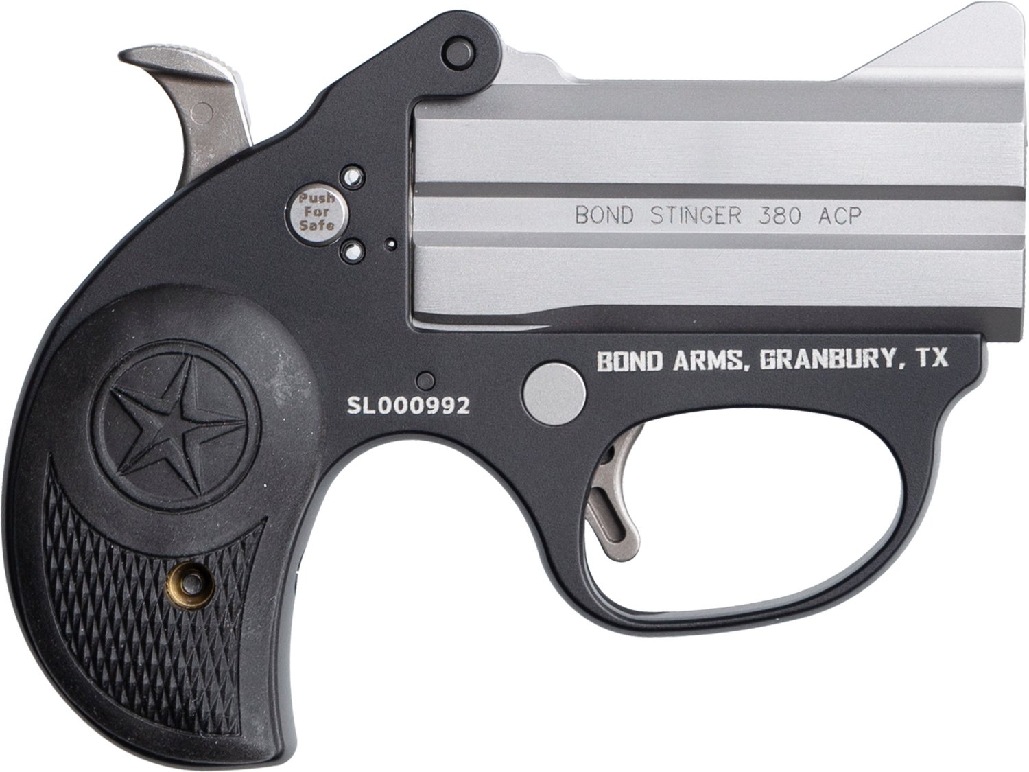 Bond Arms Stinger 380ACP Stainless Barrel/Black Frame. The pistol features single action firing, and a 3-inch stainless steel matte barrel. The pistol also features a trigger guard, and front blade and fixed rear sights.