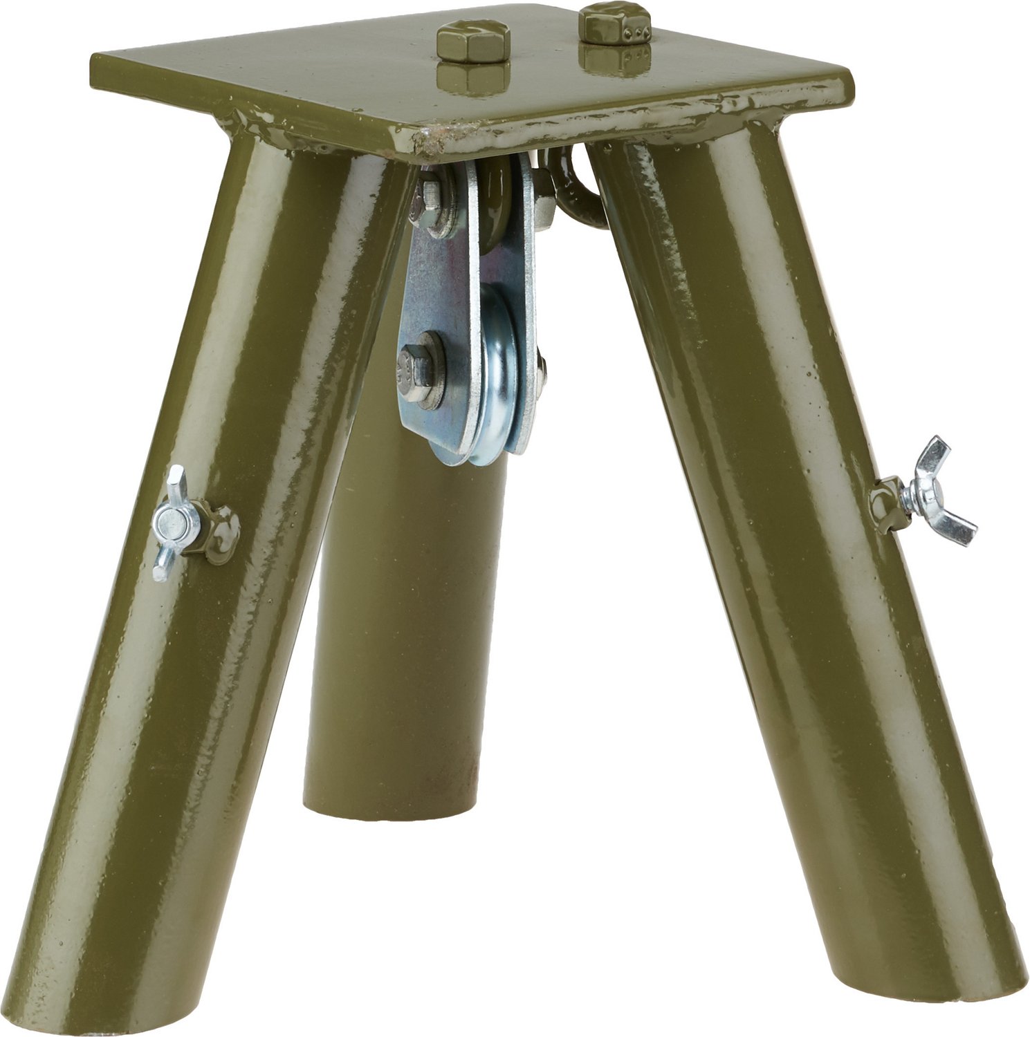 Designed with a 1,000 lb. pulley, the Boss Buck Tripod Header II with Pulley helps keep the winch from free spooling and falling to the ground under load. This header is made of steel for strength and features a 6" x 6-1/2" plate steel top and 9-1/2" pipe legs that sit at a 20° angle. Die-cast eyebolts.