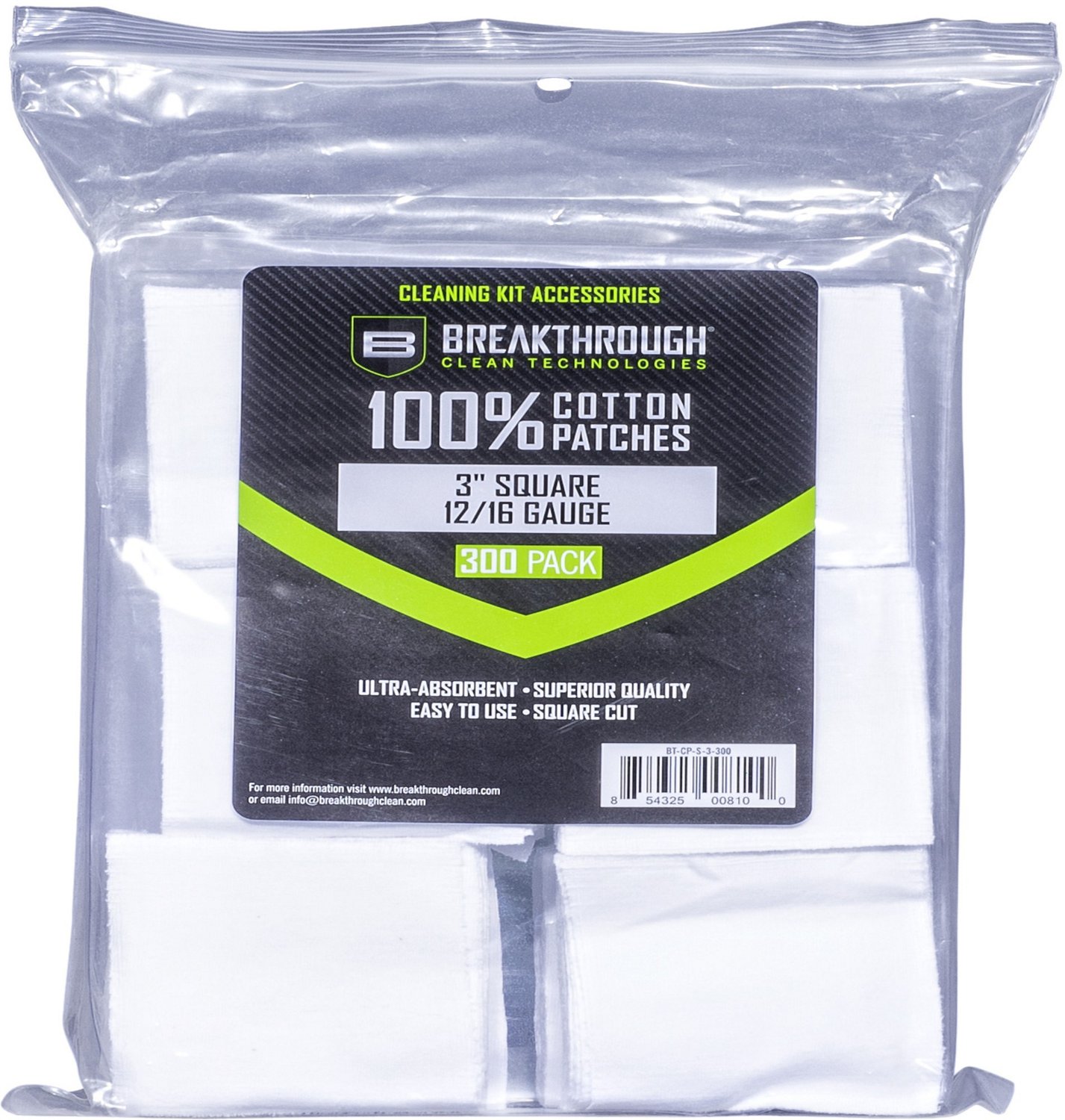 Keep your firearm in top condition with the Breakthrough 3in Square Cotton Patch 300-Pack. The 100% cotton material is super-soft and absorbent for an efficient and thorough clean. Pre-cut squares simplify setup.