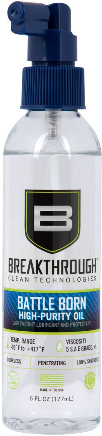 Use the Breakthrough Clean Technologies 6 oz. Battle Born High-Purity Oil Bottle to keep your gun clean. Featuring 100% synthetic oils for quality, this gun cleaner is water and steam-resistant for long-lasting use. The gun cleaner also delivers rust and corrosion protection for your firearm.