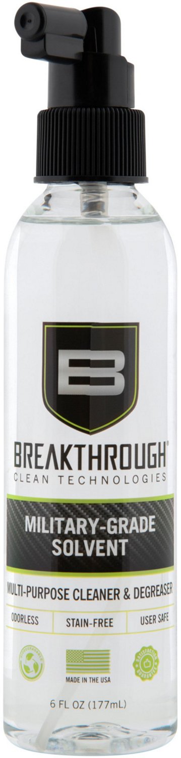 Keep your hunting equipment and guns clean by using the Breakthrough Clean Technologies Military-Grade Solvent 6 oz Bottle. This solvent cleaner and degreaser removes oil, carbon and grease build-up to help reduce the frequency needed between cleanings, and the odorless formula allows you to clean indoors without having to deal with noxious fumes. It has a low vapor pressure that eliminates freezing when in storage, and it is safe to use on wood, plastic, Cerakote, hydro-printing and polymer components.