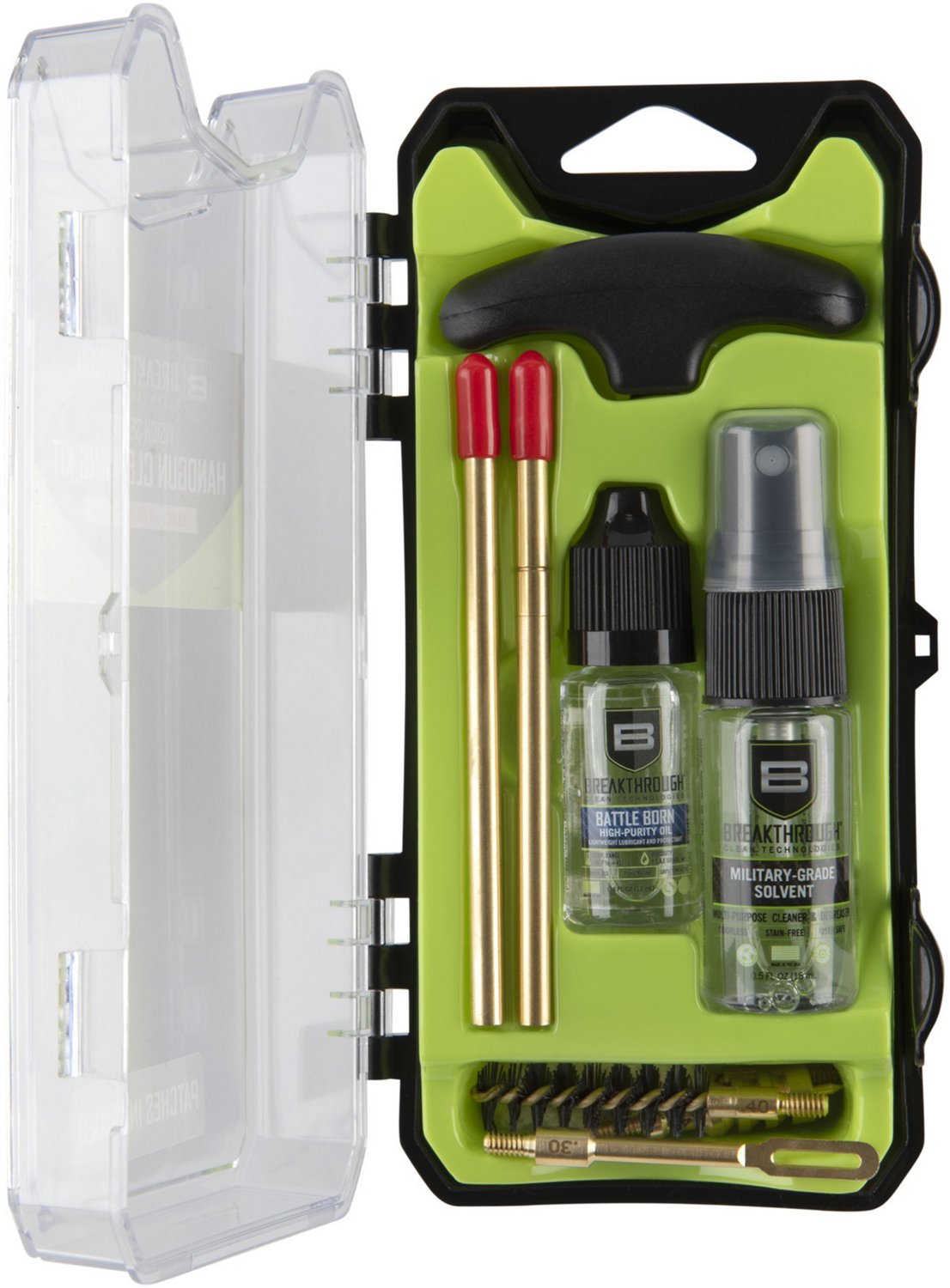 Kit includes Military-Grade Solvent, Battle Born High-Purity Oil, polymer T-handle, nylon bore brush, 2 brass rods, brass jag, brass patch holder and patches