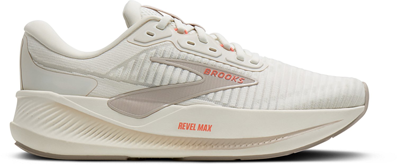 Head out on the trail for a jog in comfort and style wearing these Brooks Women's Revel Max Running Shoes. Flexible warp-knit stretch-fabric uppers and an open-structure design enable the shoes to conform to your feet and breathe easily, keeping them cooler for longer. GlideRoll rockers make for smooth transitions from heel to toe.