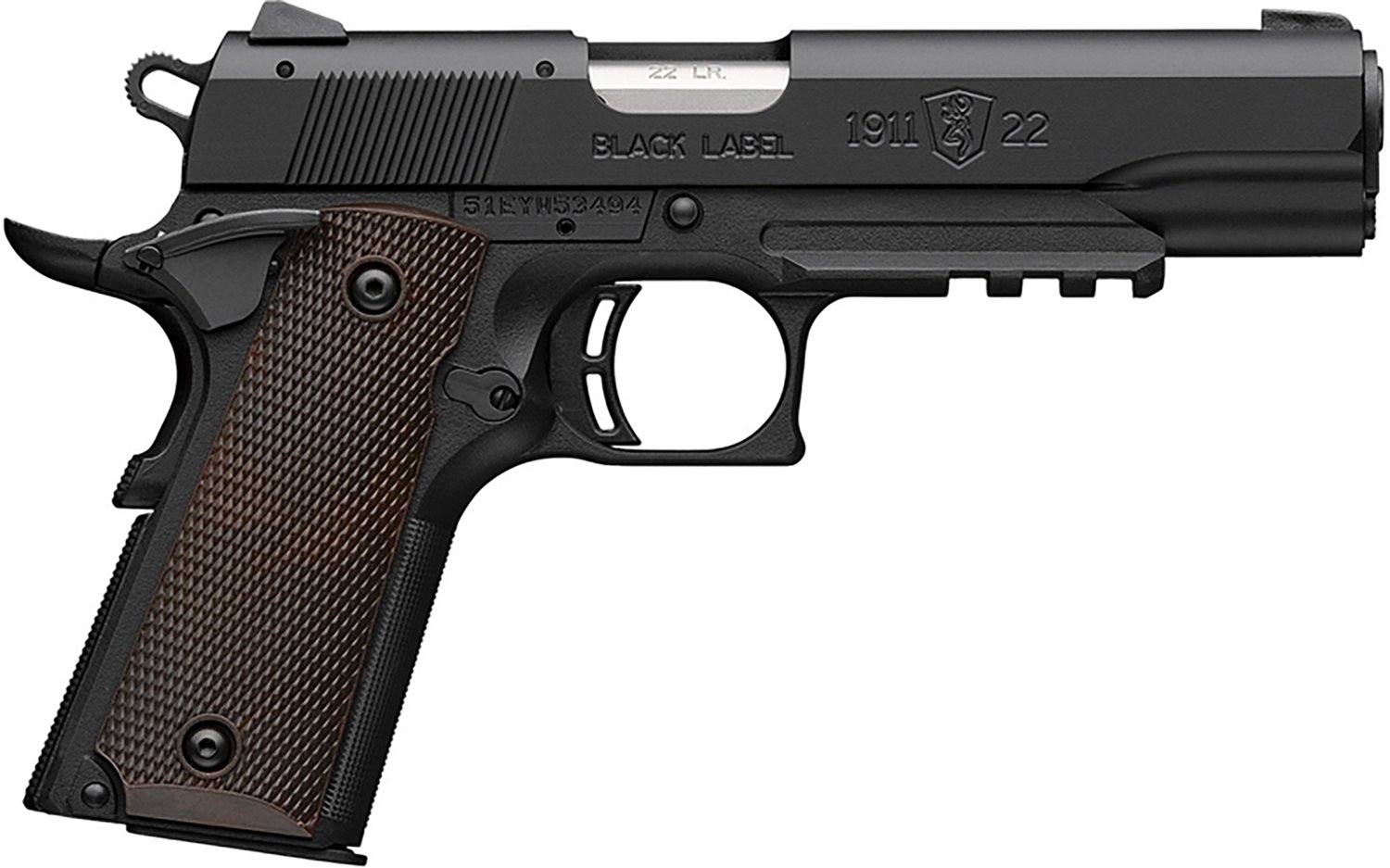 Arm yourself with the Browning 1911-22 A1 .22 LR Pistol. It is single action with a 10-round capacity. The steel barrel with a matte finish is 4.25-inches long, and it is equipped with a molded grip. The Black A1 front and rear sights finish off the design.
