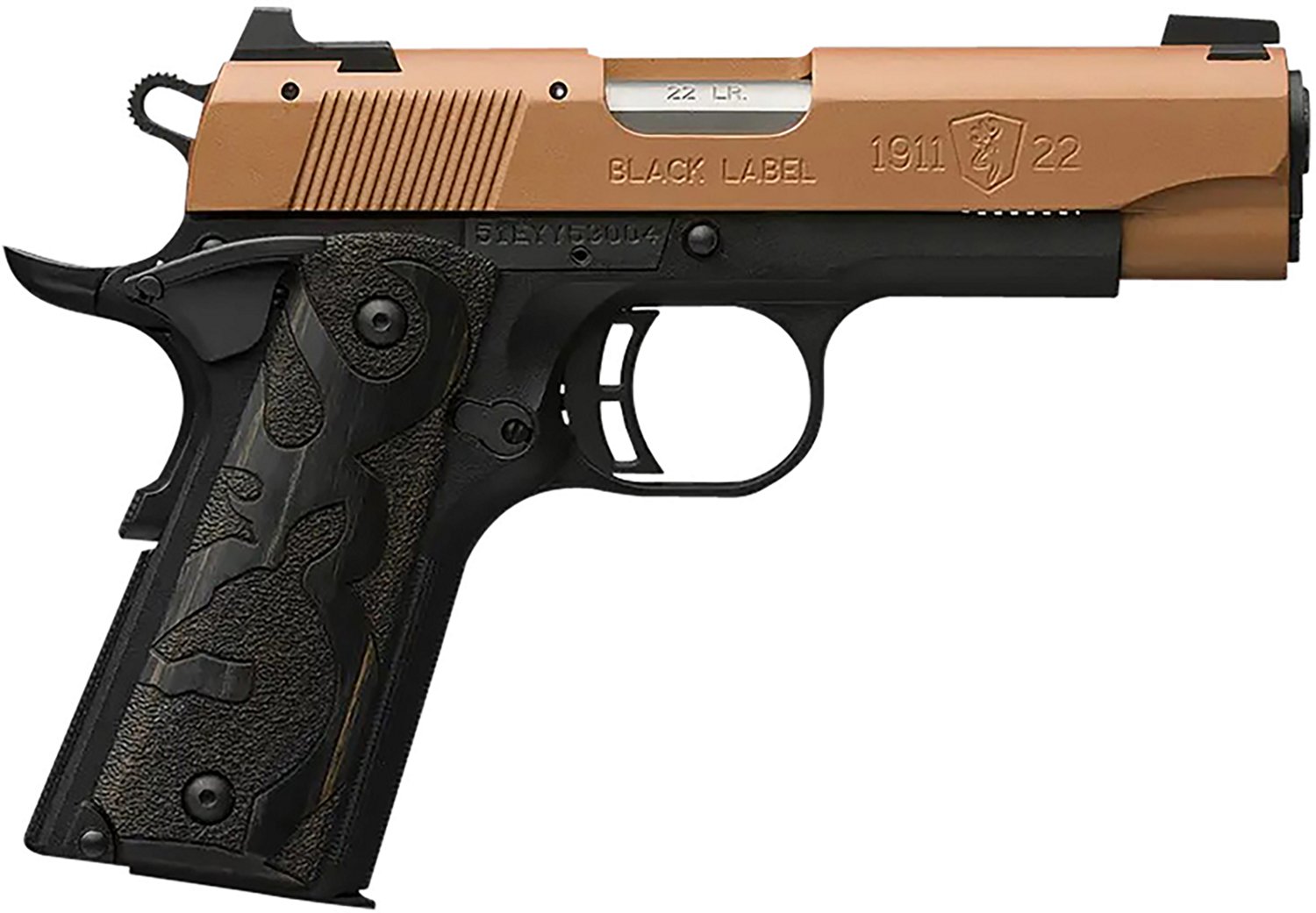 Arm yourself with the Browning 1911-22 Black Label .22 LR Pistol. It is single action with a 10-round capacity. The steel barrel with a matte finish is 3.625-inches long, and it is equipped with steel 3-dot sights. The black, stippled laminated wood grips with Buckmark logo finish off the design.