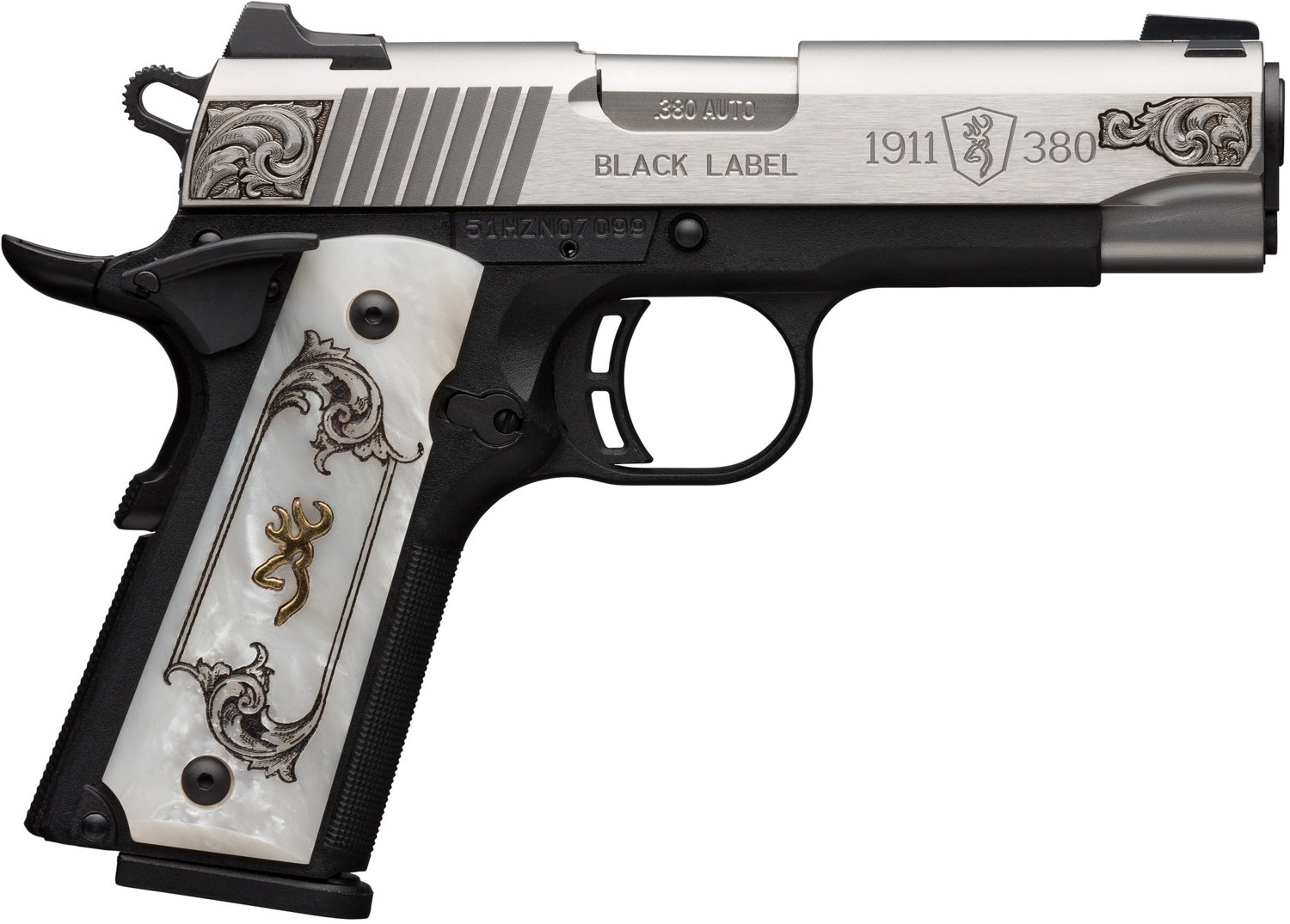 The Browning 1911-380 Black Label Medallion Stainless Engraved 3DT .380 ACP Pistol features a machined steel barrel and slide, both engraved with polished flats and matte curves. It has a composite frame and alloy subframe with imitation pearl grips and matching engravings.
