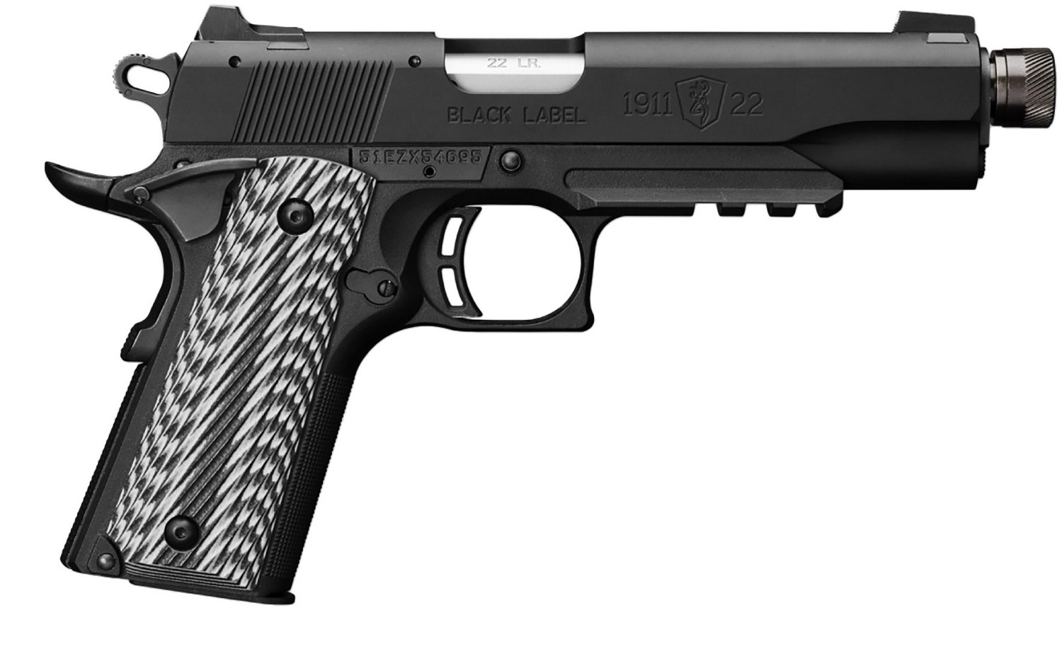Boasting postmodern style, the Browning 1911 Black Label Suppressor-Ready .22 LR Pistol with Rail comes outfitted with a G10 grip and dovetail combat 3-dot sights. The barrel is threaded and ready to accept a suppressor or silencer. The high-strength frame is made from lightweight aluminum alloy and features both manual and beavertail grip safeties. 1913 Picatinny rail. Includes an ABS storage case and a 10-round magazine.