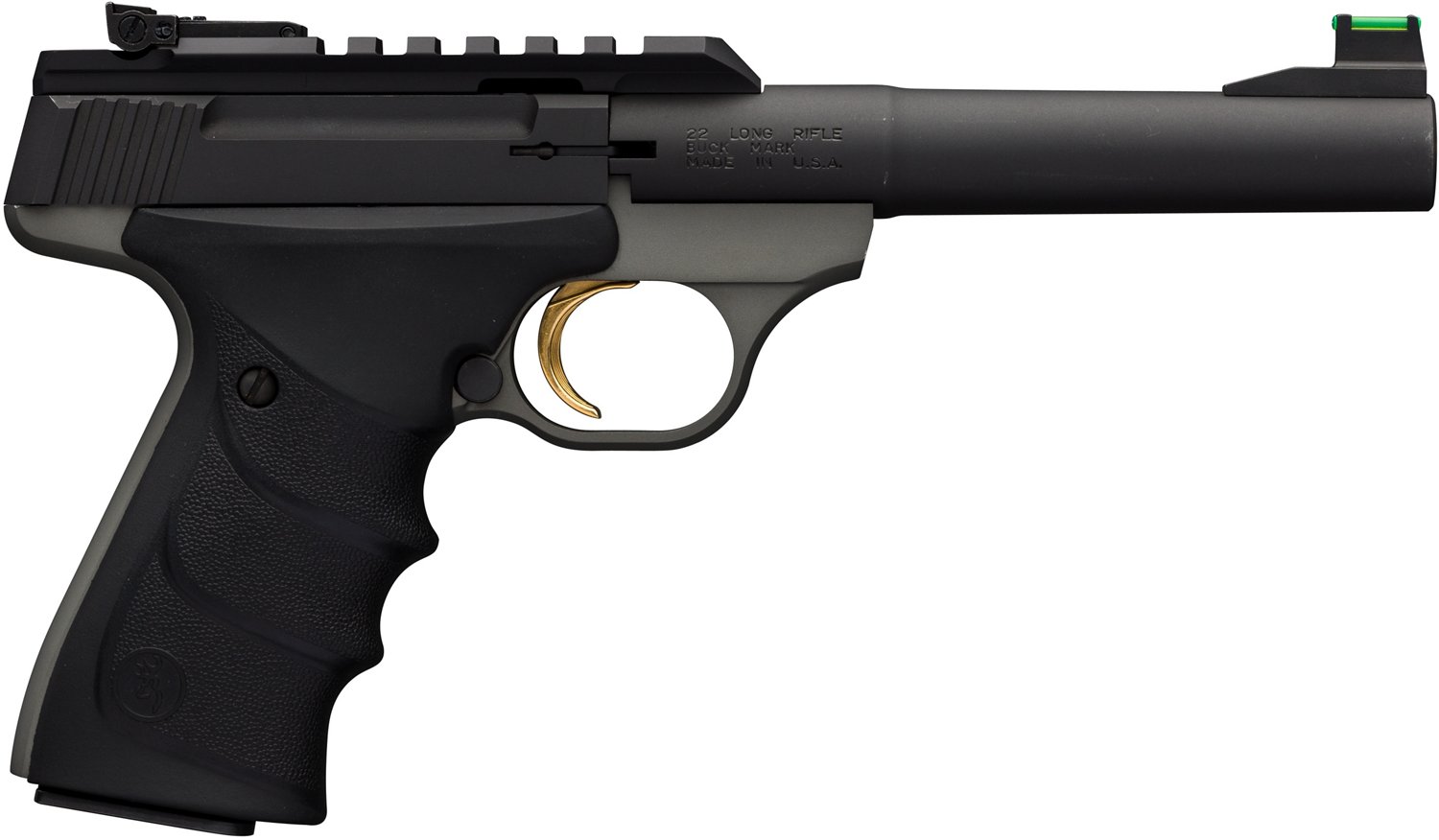 Enhanced for functionality, the Browning Buck Mark Plus Practical URX .22 LR Pistol has a fiber-optic front sight and a Pro-Target rear sight. It even comes with textured Ultragrip RX grips, a 1913 Picatinny rail and a tapered bull barrel. It's all built on a blued, aluminum-alloy frame. Gold-plated trigger.