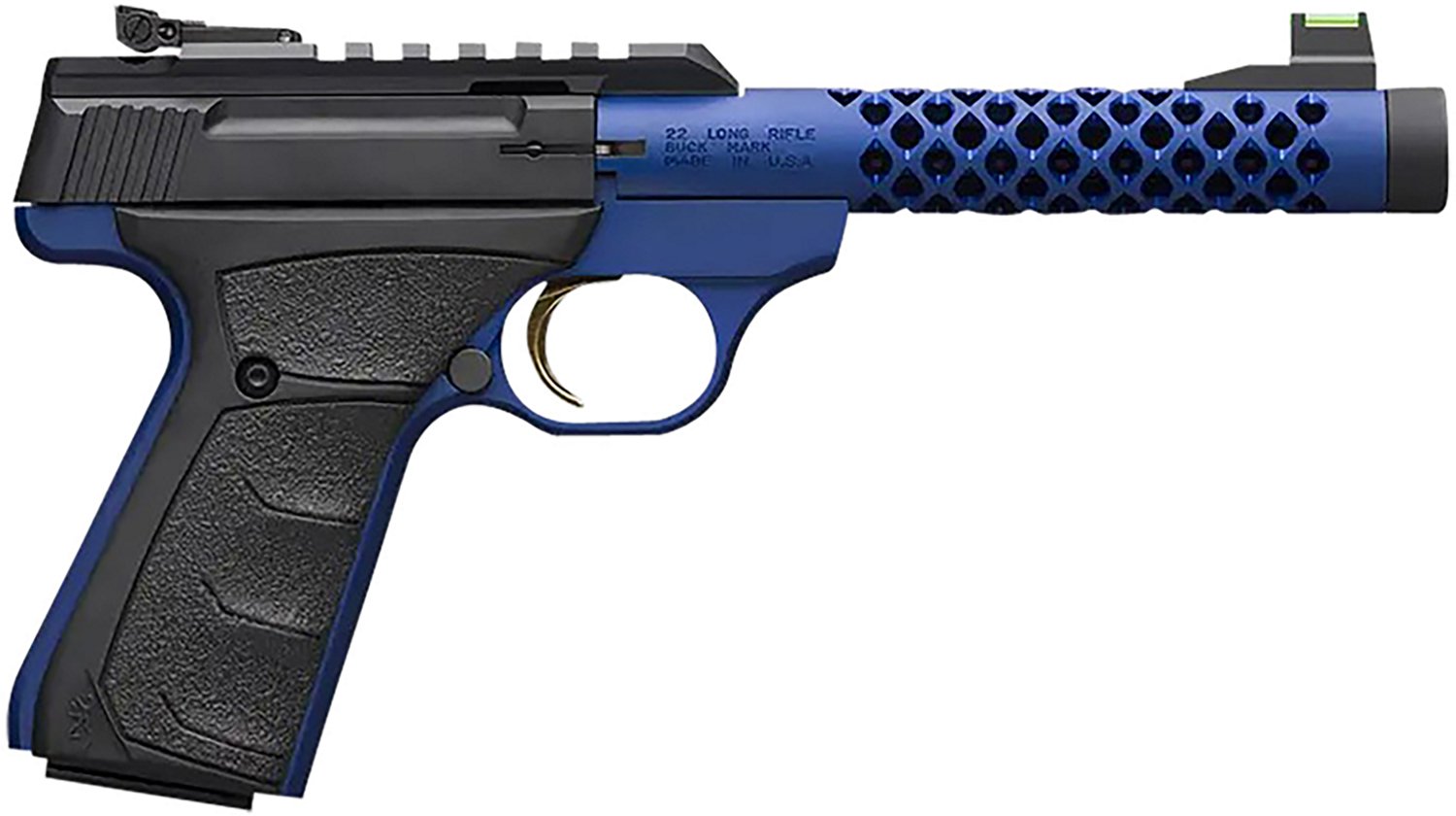 Arm yourself with the Browning Buck Mark + Vision Triad .22 LR Pistol. It is single action with a 10-round capacity. The steel barrel with an anodized blue finish is 5.875-inches long, and it is equipped with an aluminum alloy receiver with an anodized blue finish. The fiber optic front sight and white outline Pro-Target rear sight finish off the design.