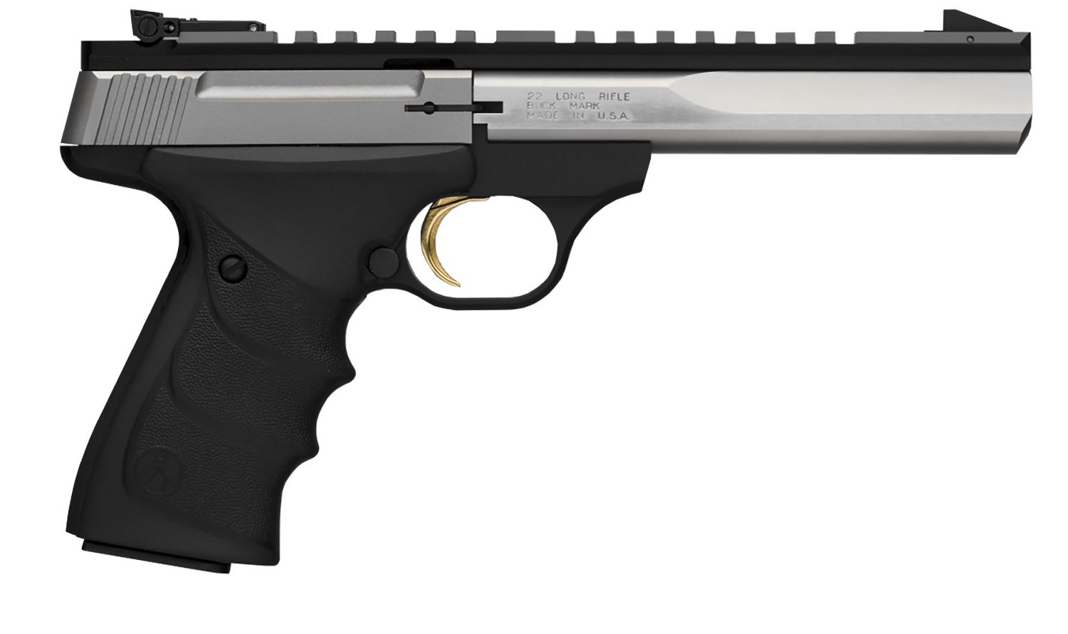 Fashioned with a full-length Picatinny scope base, the Browning Buckmark Contour URX .22 LR Pistol comes field ready. It's built with an aluminum-alloy frame and stainless-steel slide and 5.5-inch contoured barrel. Ultragrip RX ambidextrous grips with finger grooves. Pro Target adjustable sights. Includes a pistol rug.
